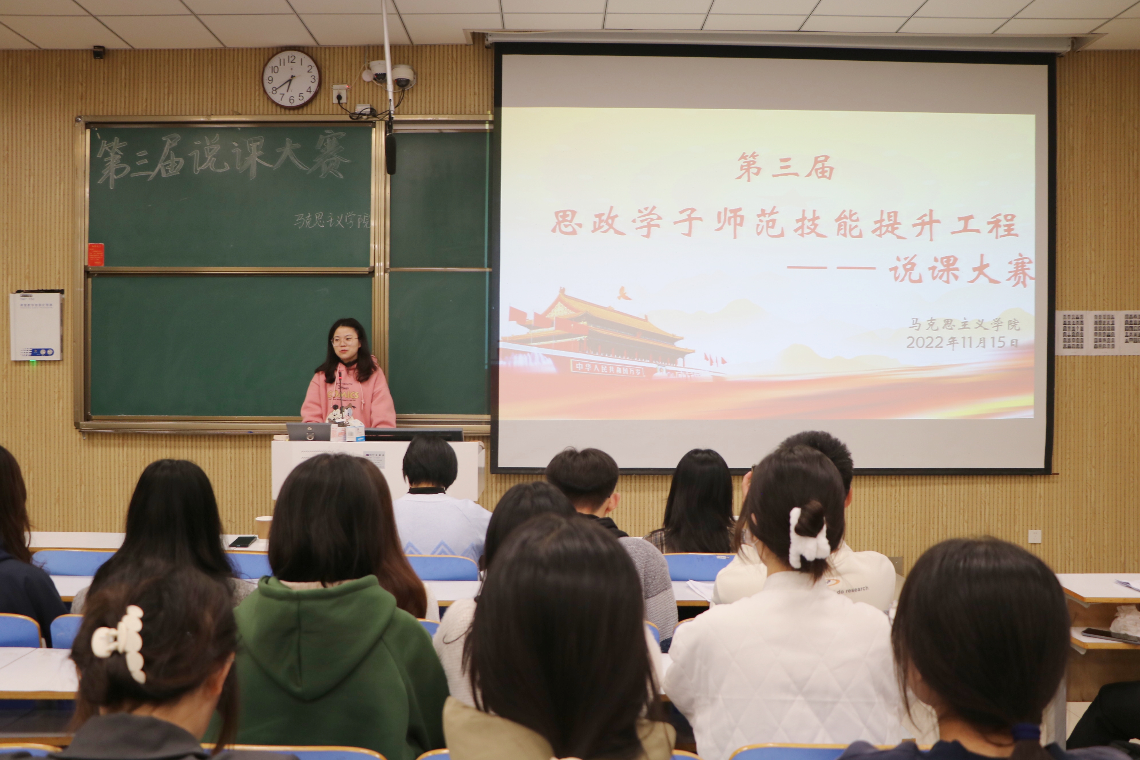 为增强学科专业素养,提升思政师范生教学技能,11月15日晚上,由pp电子官方网站主办、学生会学术科技部和南湖理论研讨社共同承办的说课大赛初赛在社科楼515教室顺利举办。pp电子官网教学秘书郑晨霞、团委老师高小佳出席并担任评委。本次比赛由朱新语、孔德雨主持。