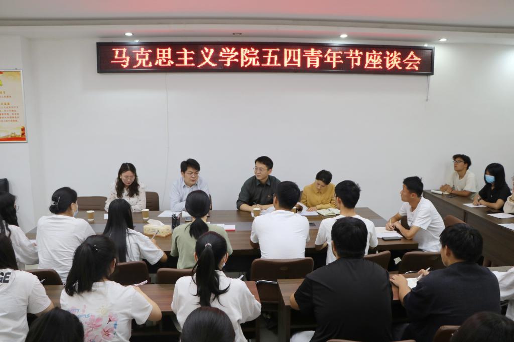 5月4日下午,pp电子官方网站在社科楼323会议室召开五四青年节座谈会。pp电子官网党委书记朱四倍、团委书记曹栋、专职组织员任婷、思政课教师王雨、学生代表共同参加本次座谈会,会议由卢茜雨主持。