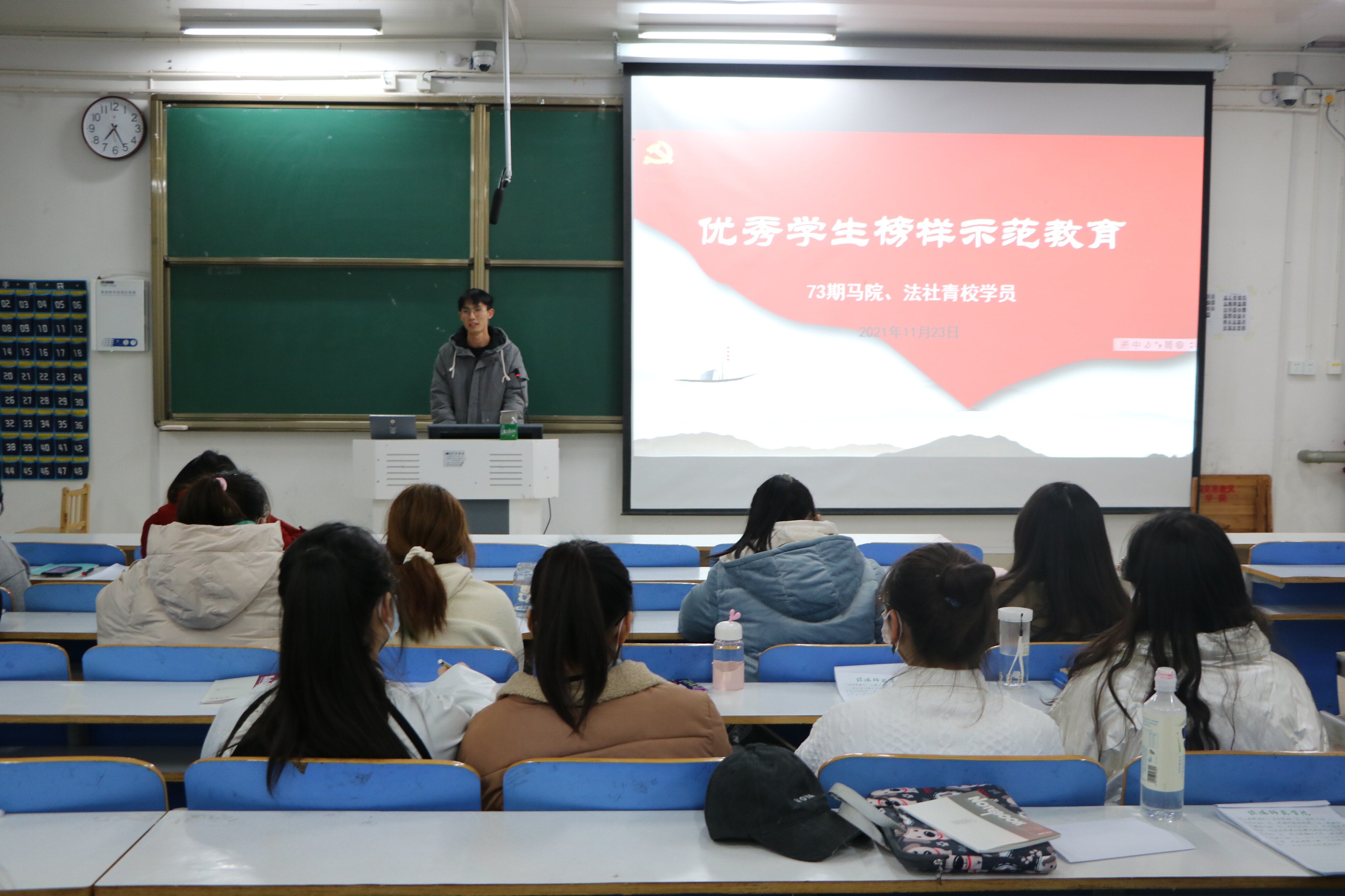 11月23日晚,pp电子官方网站和法学与社会学学院第73期青校学员在社科楼516教室开展优秀学生榜样师范教育活动。活动由法学与社会学学院组长张璨主持。