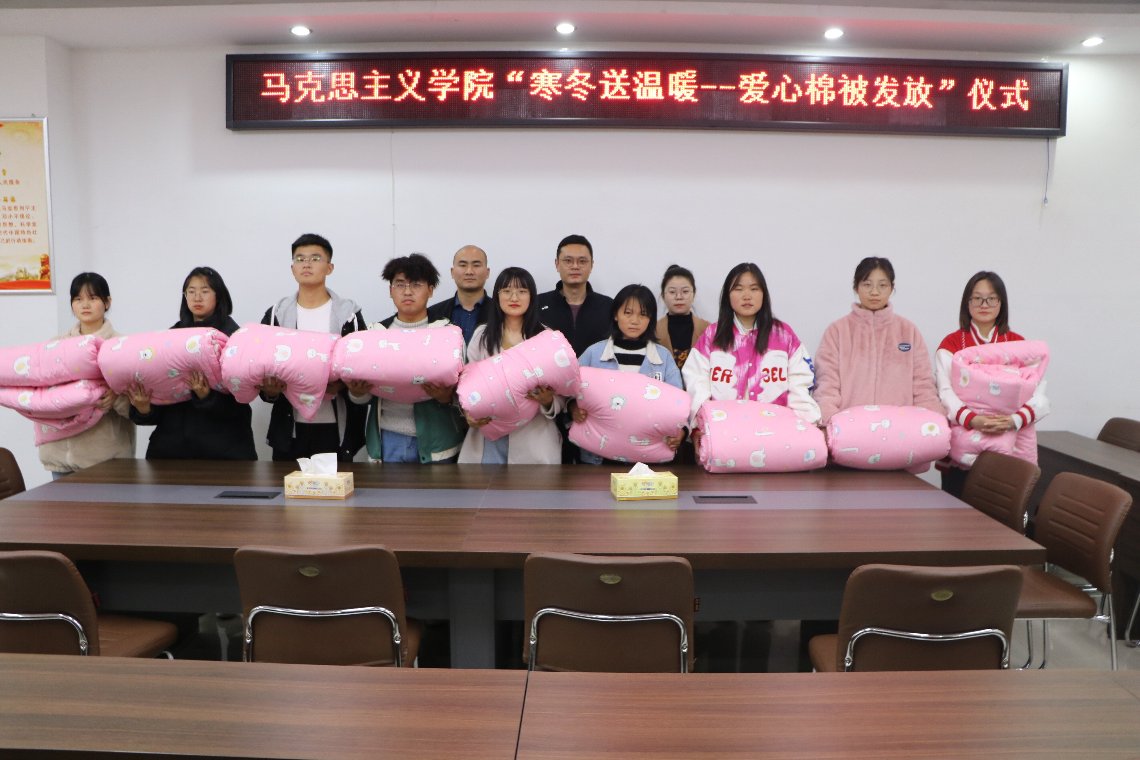 寒冬将至,温暖不止。11月26日下午,pp电子官方网站在社科楼323会议室举行爱心棉被发放仪式。pp电子官网党委副书记黄煌、班主任高小佳、周文豪及受资助学生共同参加此次仪式。仪式由黄煌主持。