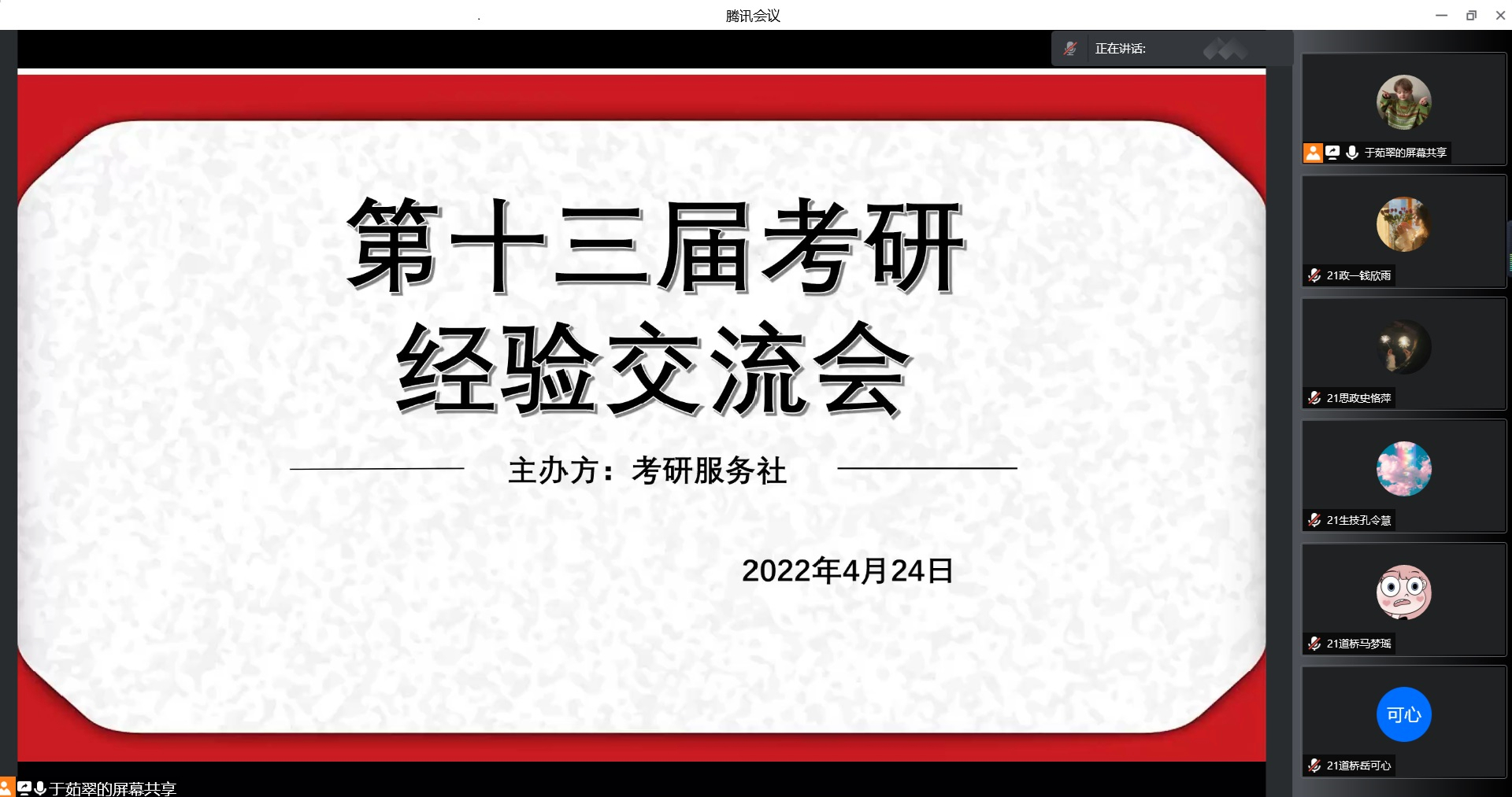 4月24日晚,考研服务社在腾讯会议召开第十三届考研经验交流会。pp电子官方网站党委副书记黄煌、团委书记曹栋、4位优秀考研学子及百名学生共同参与本次交流会。会议由考研服务社社长于茹翠主持。