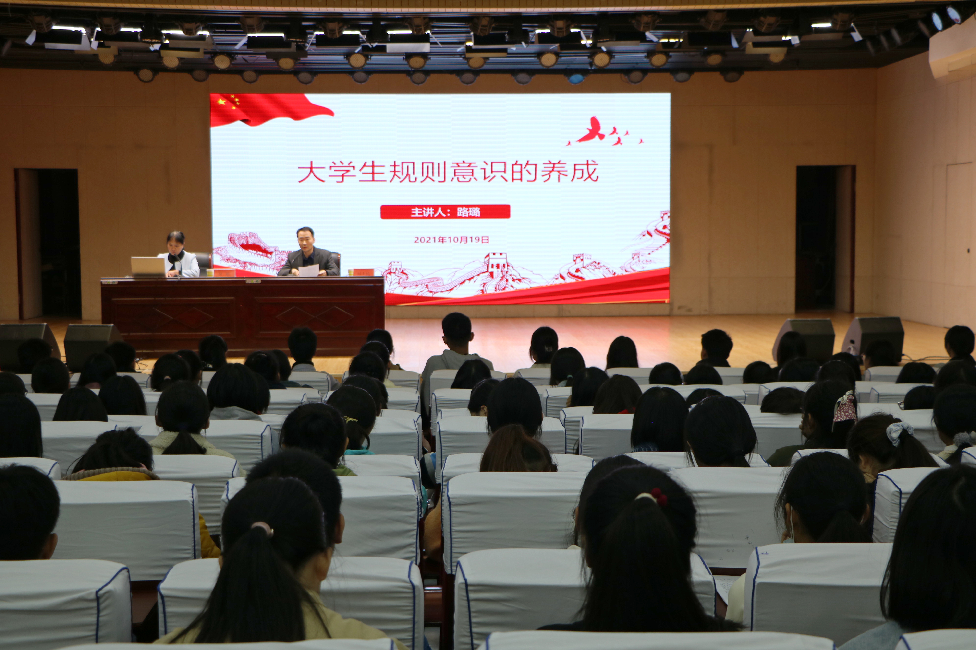 为强化对新生团员的教育引导,助力他们养成规则意识,10月19日晚,旅游学院党委副书记路璐在理科楼报告厅为pp电子官方网站、数学与统计学院新生团员讲授题为“大学生规则意识的养成”的主题团课,数学与统计学院党委副书记刘丰铭、团委书记张艺成、pp电子官方网站团委书记曹栋及两院新生团员共同参加本次团课。团课由刘丰铭主持。