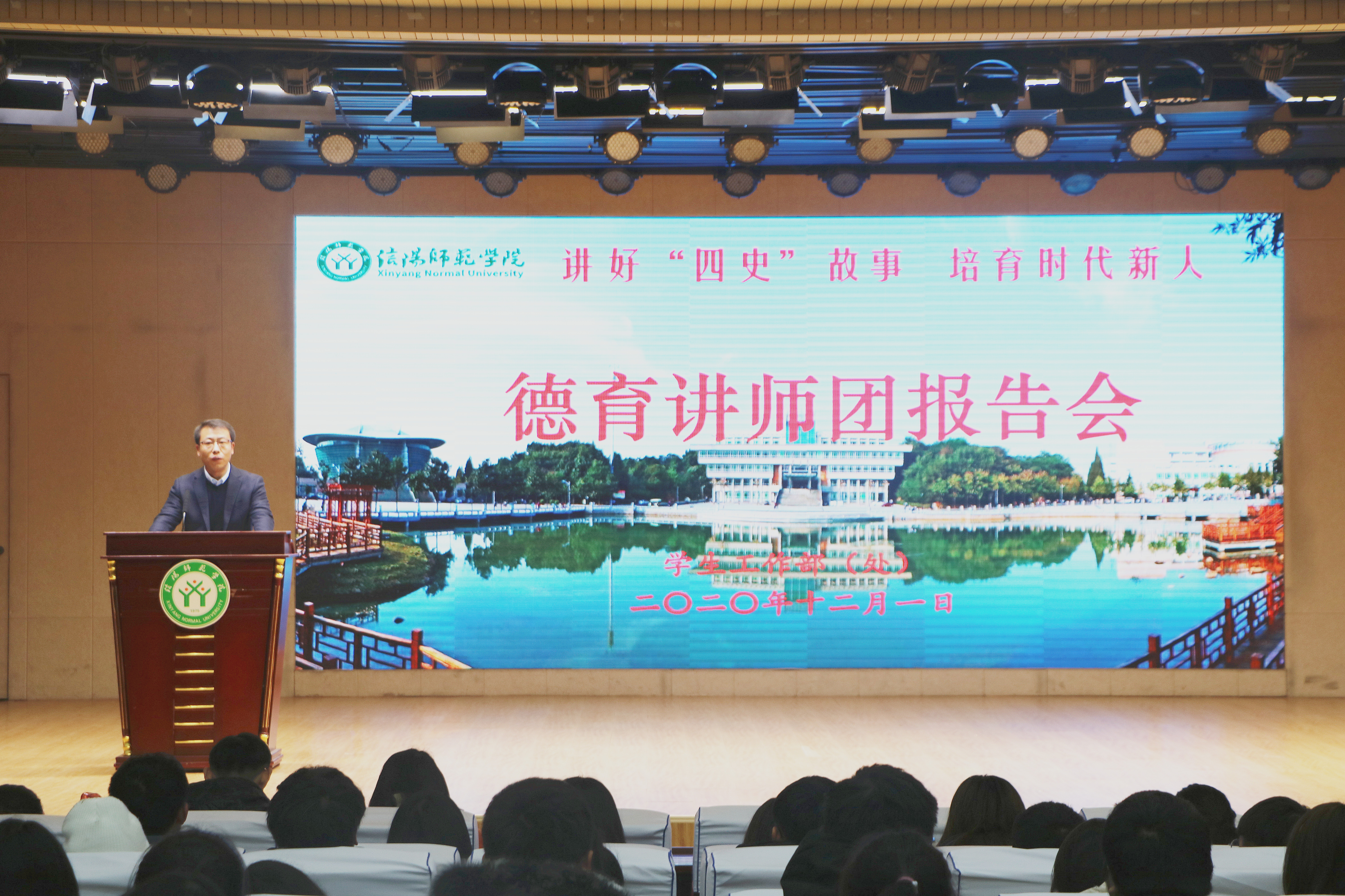 12月1日下午三点,“讲好四史故事,培育时代新人”主题报告会在理科楼报告厅顺利召开。国际教育学院党委副书记姚新春、pp电子官方网站团委书记曹栋、体育学院辅导员柴九昌、数学与统计学院辅导员谢艳丽、文学院辅导员郭子悦、教育科学学院辅导员田园出席本次会议。pp电子官方网站、体育学院、国际教育学院和商学院部分新生共同聆听本次会议。会议姚新春主持。