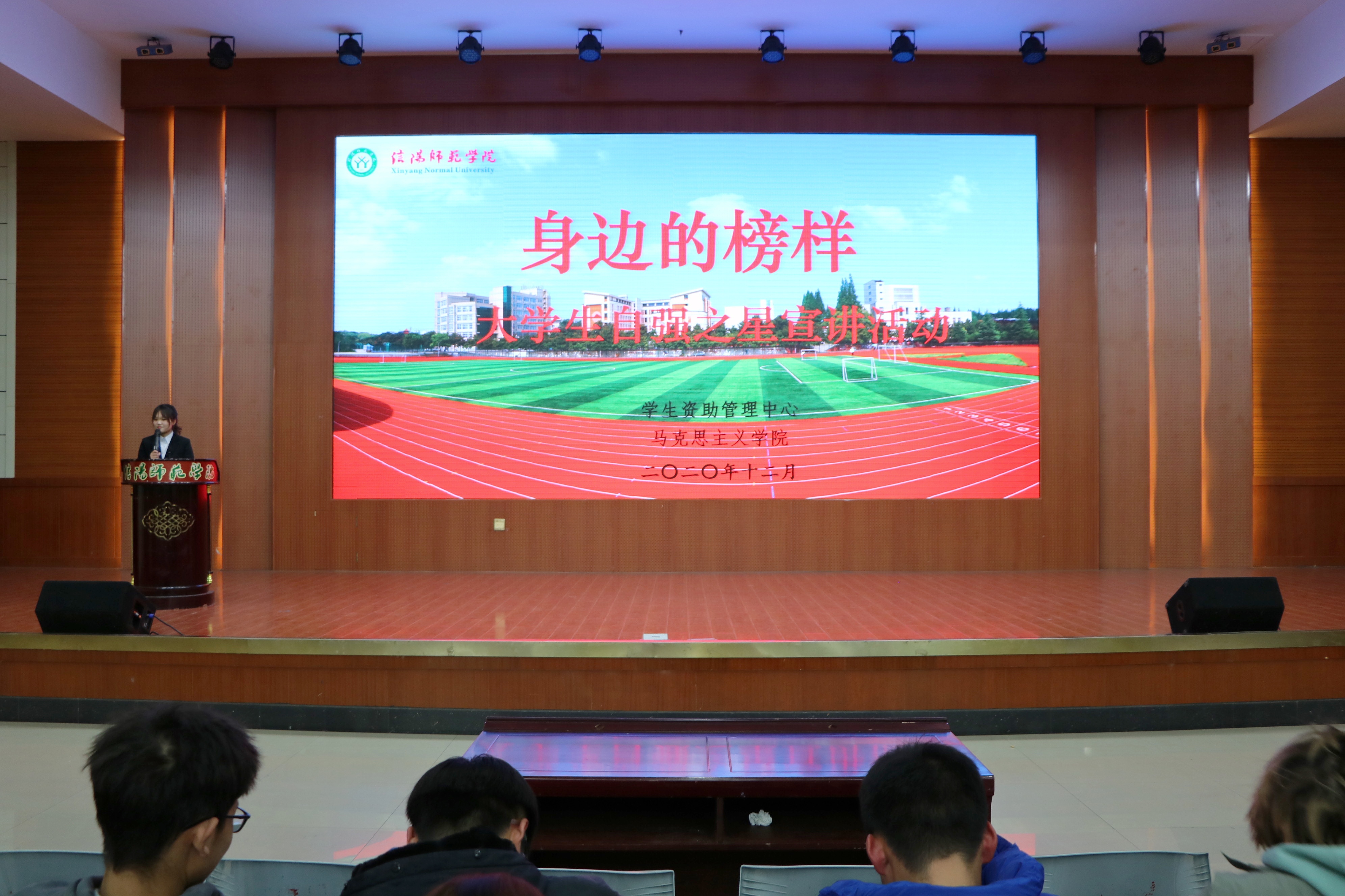 为大力推进大学生思想教育工作,彰显榜样力量,激励pp电子官网学子艰苦奋斗、顽强拼搏,12月16日晚,由pp电子官方网站主办的“身边的榜样”大学生宣讲活动在逸夫楼报告厅举办。pp电子官网团委老师曹菁菁、数学与统计学院贾晴岚、体育学院王梦卓、音乐与舞蹈学院许美佳以及pp电子官网2019级、2020级全体学生共同参加此次活动。活动由曹菁菁主持。