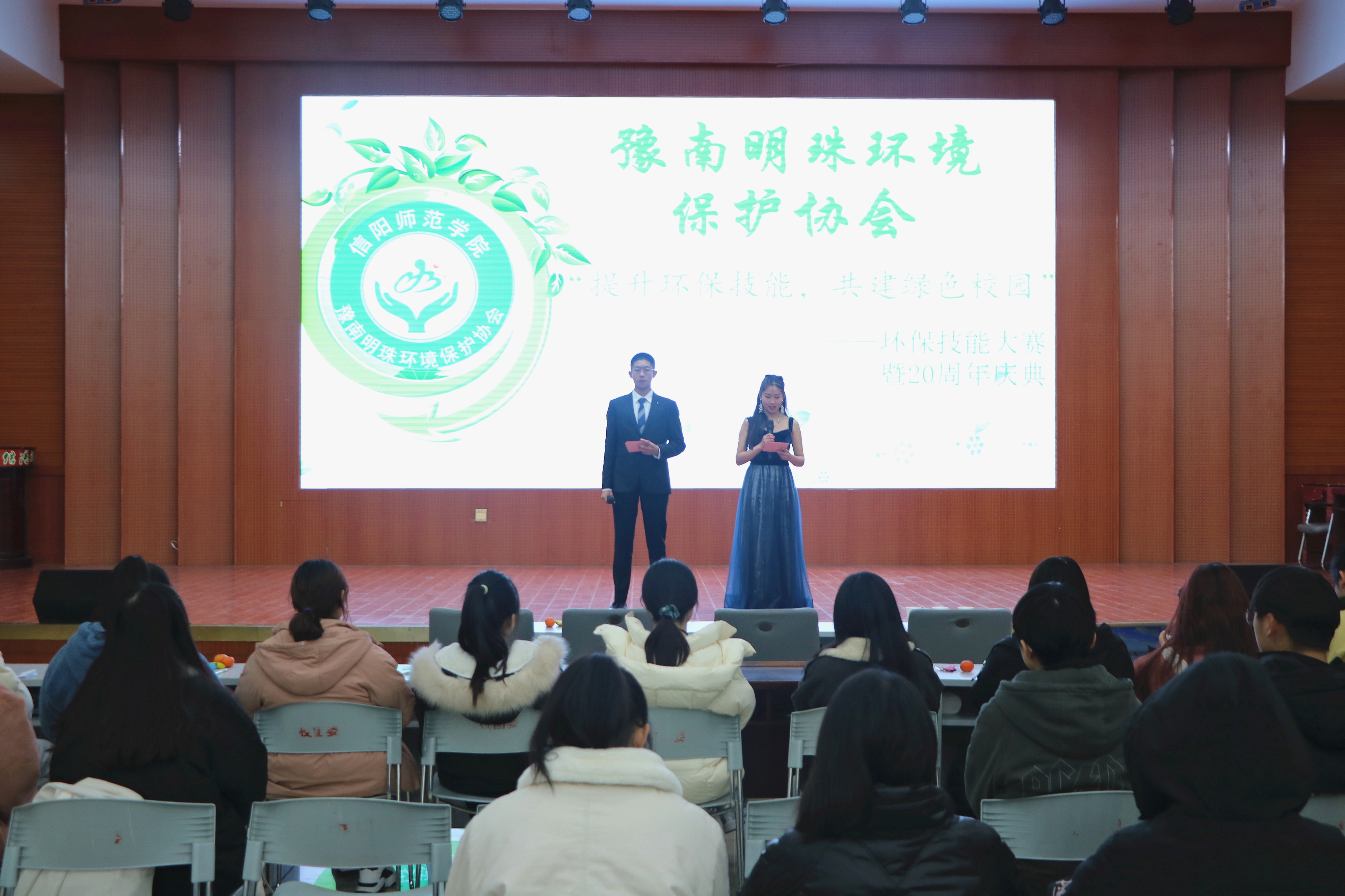 12月24日晚,pp电子官方网站豫南明珠环境保护协会“提升环境技能,共建绿色校园”环保技能大赛暨20周年庆典在逸夫楼报告厅成功举办。各学院社团负责人以及数百名学生共同参加本次活动。大赛由常钰梅和戚大宝主持。