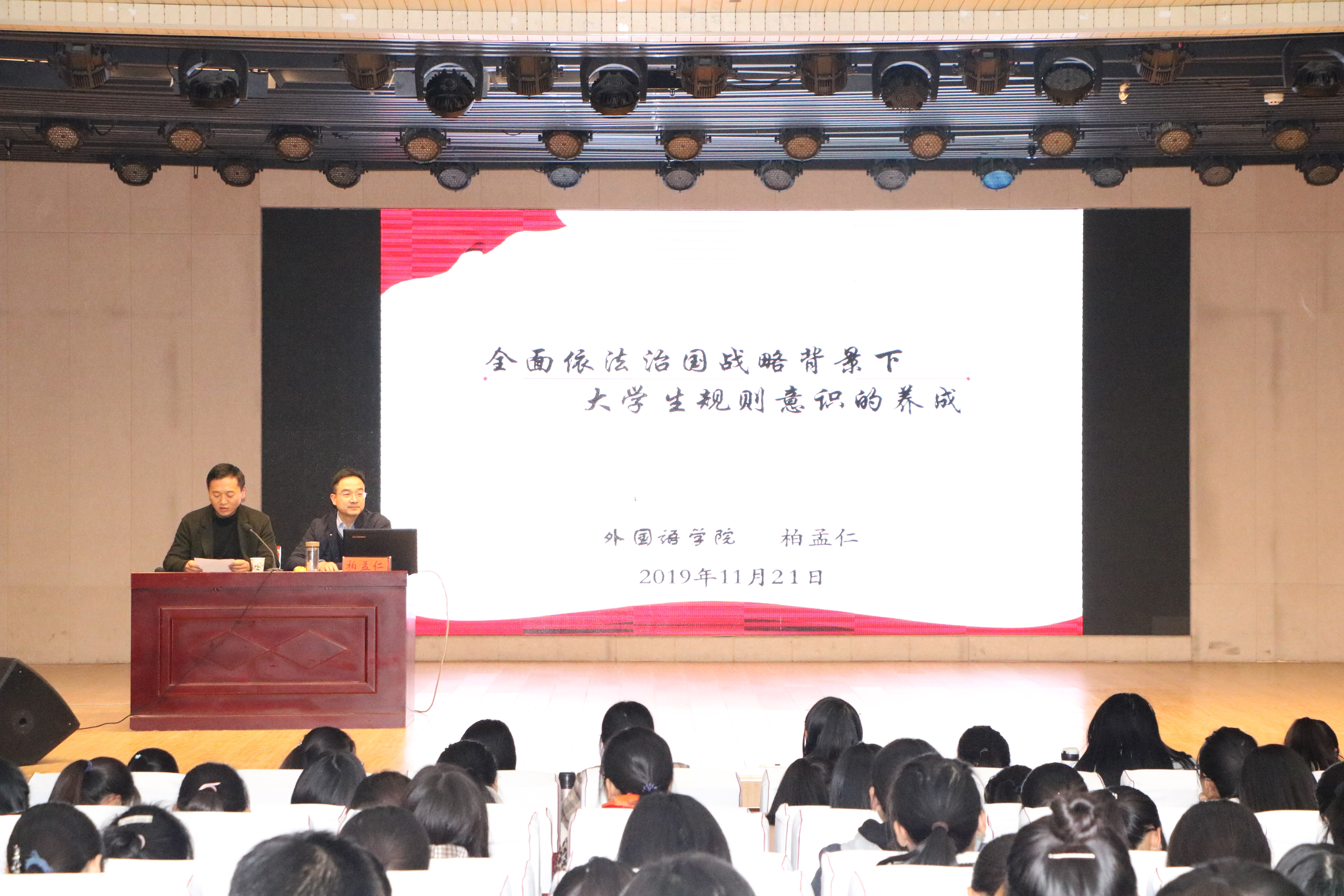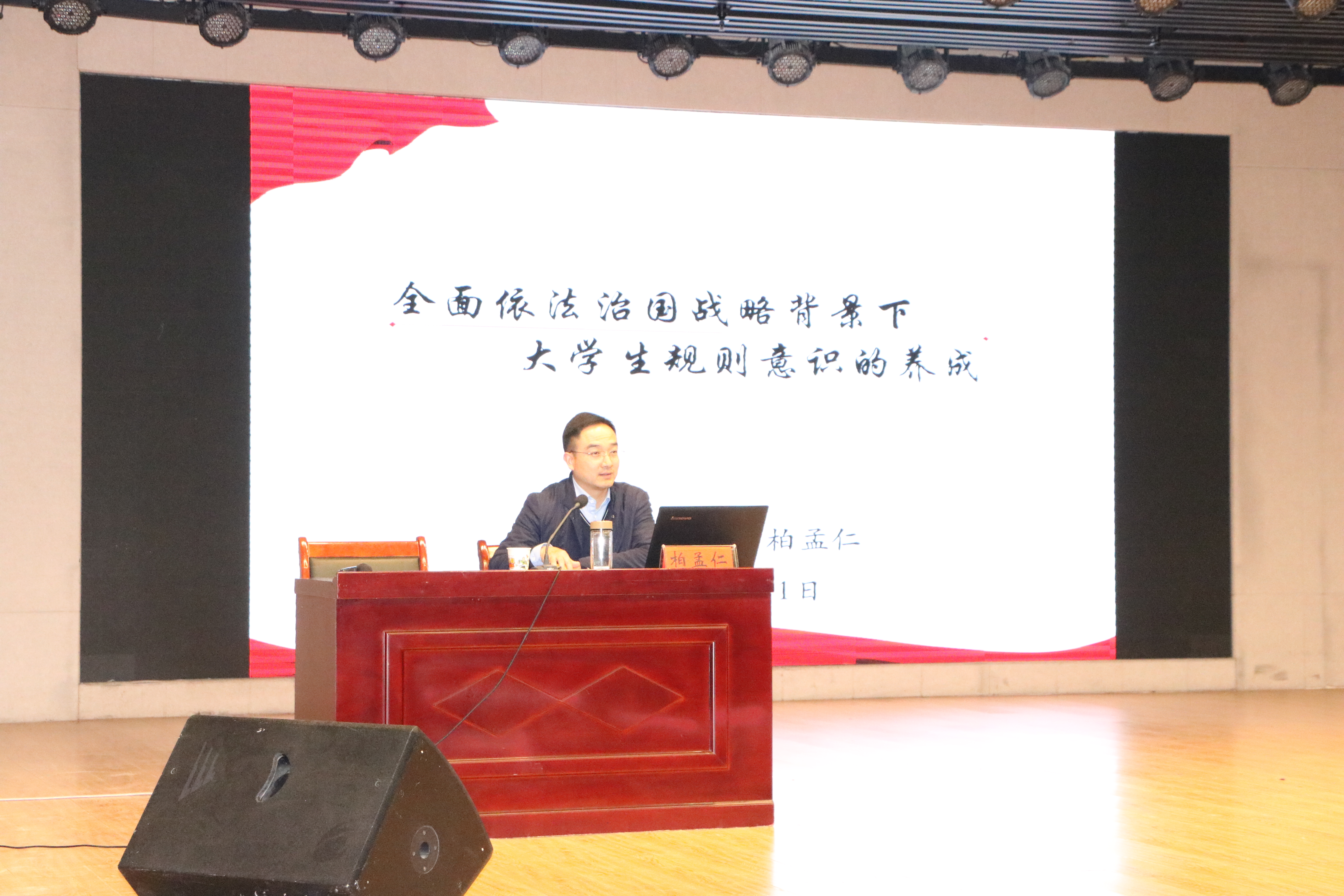 11月21日下午,外国语学院党委副书记柏孟仁在理科楼报告厅为pp电子官方网站和化学化工学院新生团员讲授题为“全面依法治国战略背景下大学生规则意识的养成”的主题团课。pp电子官方网站团委书记曹栋、化学化工学院团委老师赵方方及pp电子官方网站、化学化工学院全体新生团员共同聆听本次团课。