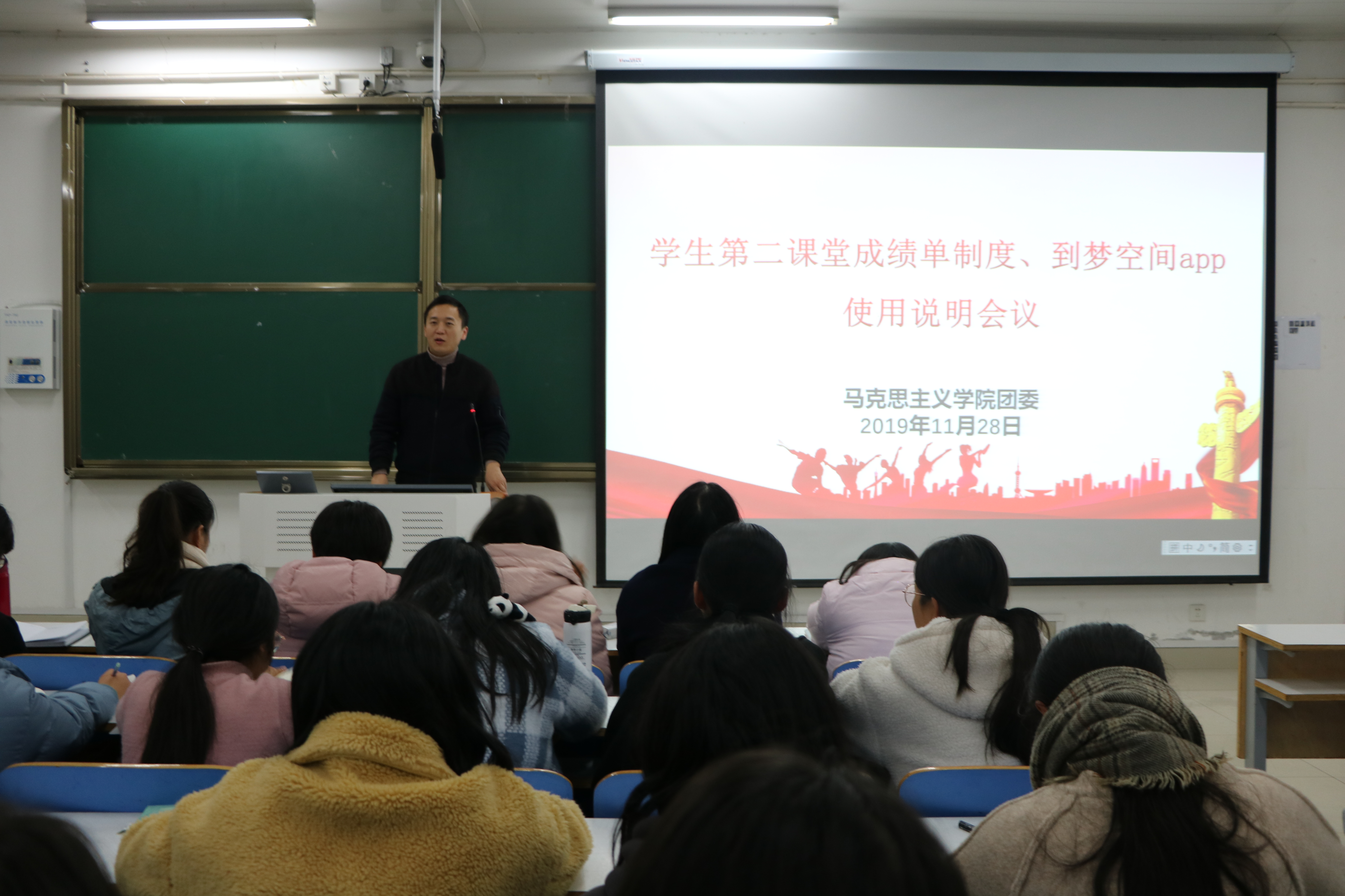 为帮助同学们熟悉并掌握“到梦空间”软件的使用规则,发挥第二课堂的辅助作用,11月28日下午,pp电子官方网站团委在社科楼516教室召开第二课堂成绩单制度与“到梦空间"软件使用说明会。pp电子官方网站团委书记曹栋、学生会主席团成员、学院到梦空间负责人及2019级全体学生共同参加本次会议。会议由曹栋主持。