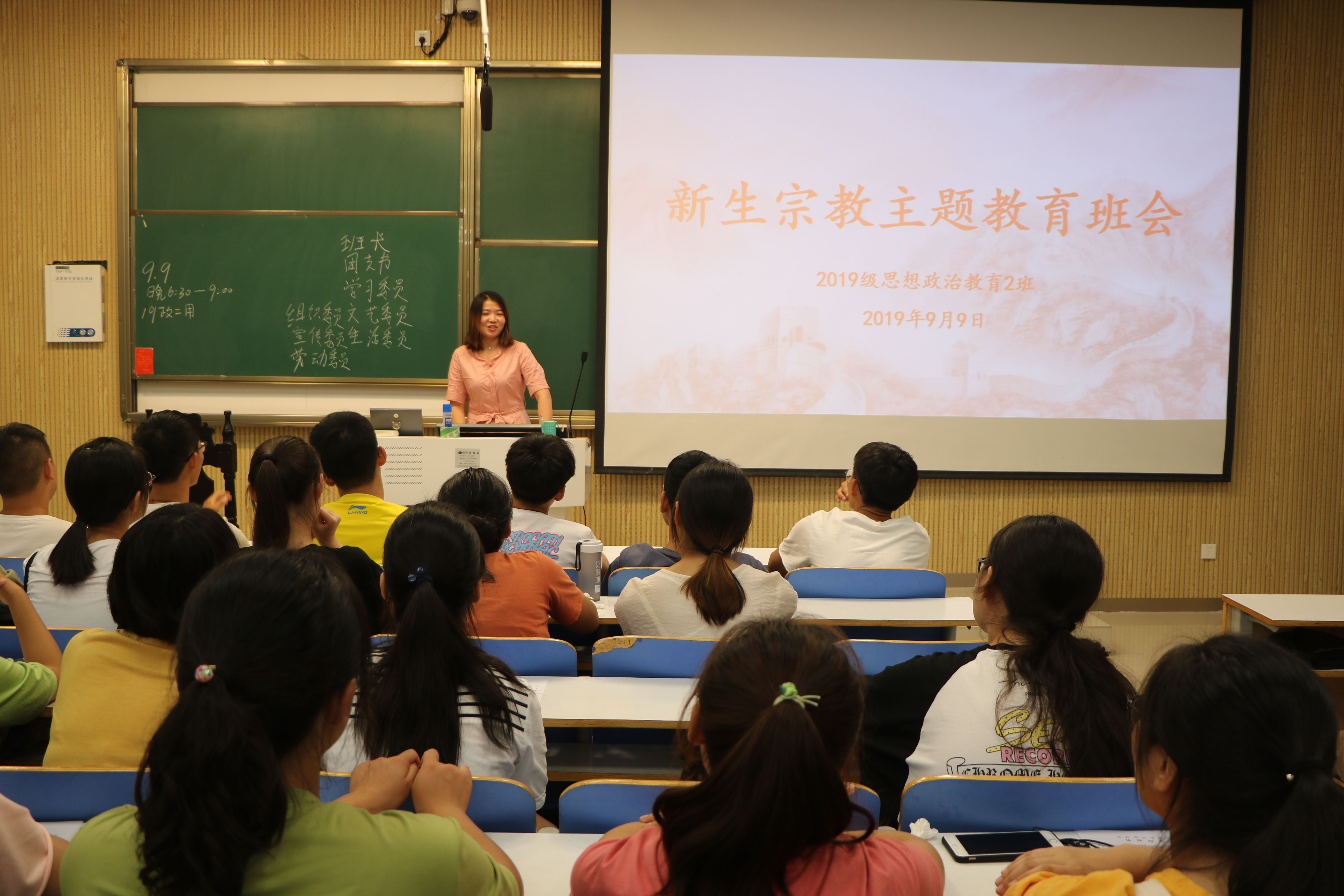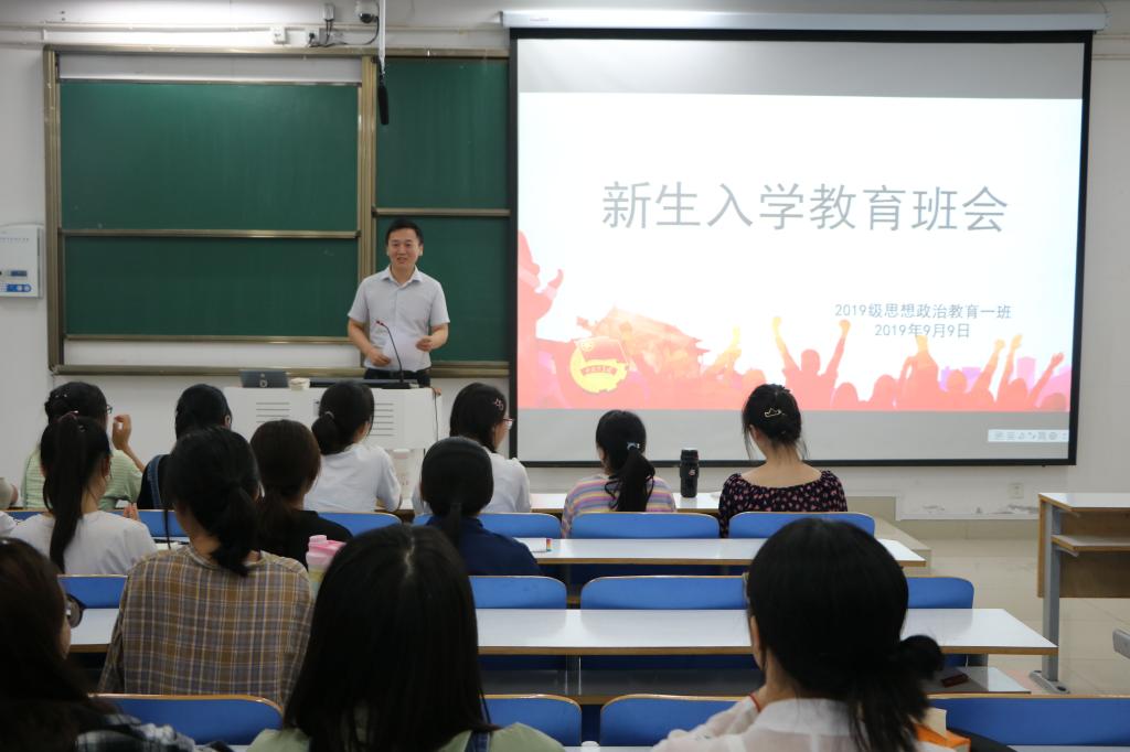 9月9日晚,pp电子官方网站在社科楼515、516教室顺利开展新生入学教育班会。团委书记曹栋、辅导员陶青青以及2019级全体新生共同参加了此次班会。班会由班级负责人王文芳、王雅纯、曲新宇和艾子元主持。