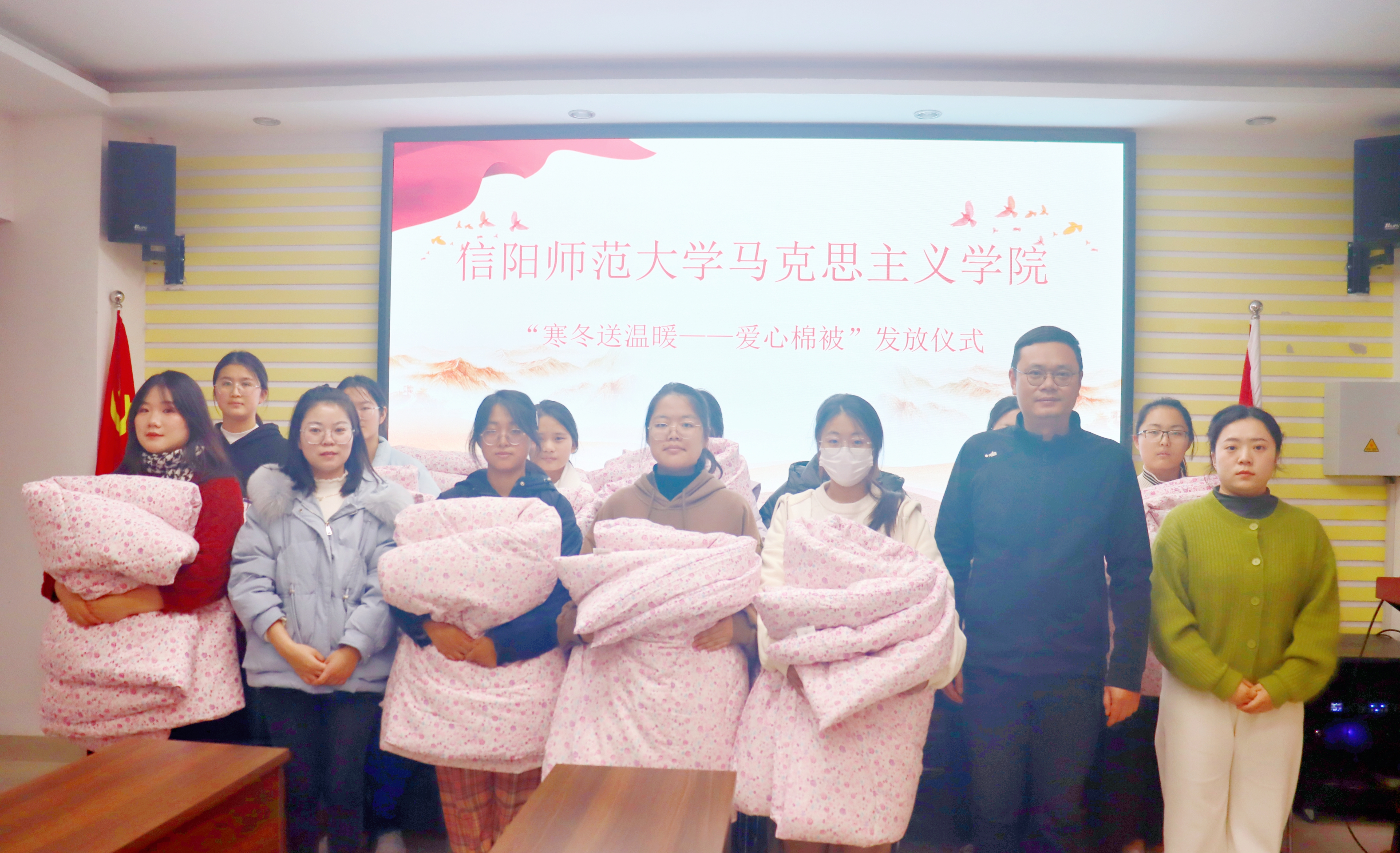 寒风凛冽,被暖人心。仪式伊始,黄煌与在场师生进行亲切交谈。他指出,“寒冬送温暖--爱心棉被发放”活动是学校高度重视学生资助工作的体现,对落实资助育人理念具有重要意义。发放仪式中,三位老师亲手将棉被逐一递送到每一位受助学生的手中,叮嘱他们注意御寒保暖,调整状态,以更加饱满的精神状态投入到学习中去。最后,黄煌寄语受资助学生,希望他们能够将这份“温暖”内化于心、外化于行,更加努力学习专业知识,通过多渠道、多方式、多途径来提高自己的综合素质和能力,以理想者、担当者、吃苦者、奋斗者的姿态,奋进新征程,诠释新青春,创造新业绩。受助学生纷纷表示今后将努力做积极向上、自信昂扬、豁达开朗的奋进者;做知恩报恩、传递温暖、提高本领的践行者;做敢为人先、与时俱进、求真务实的开拓者。