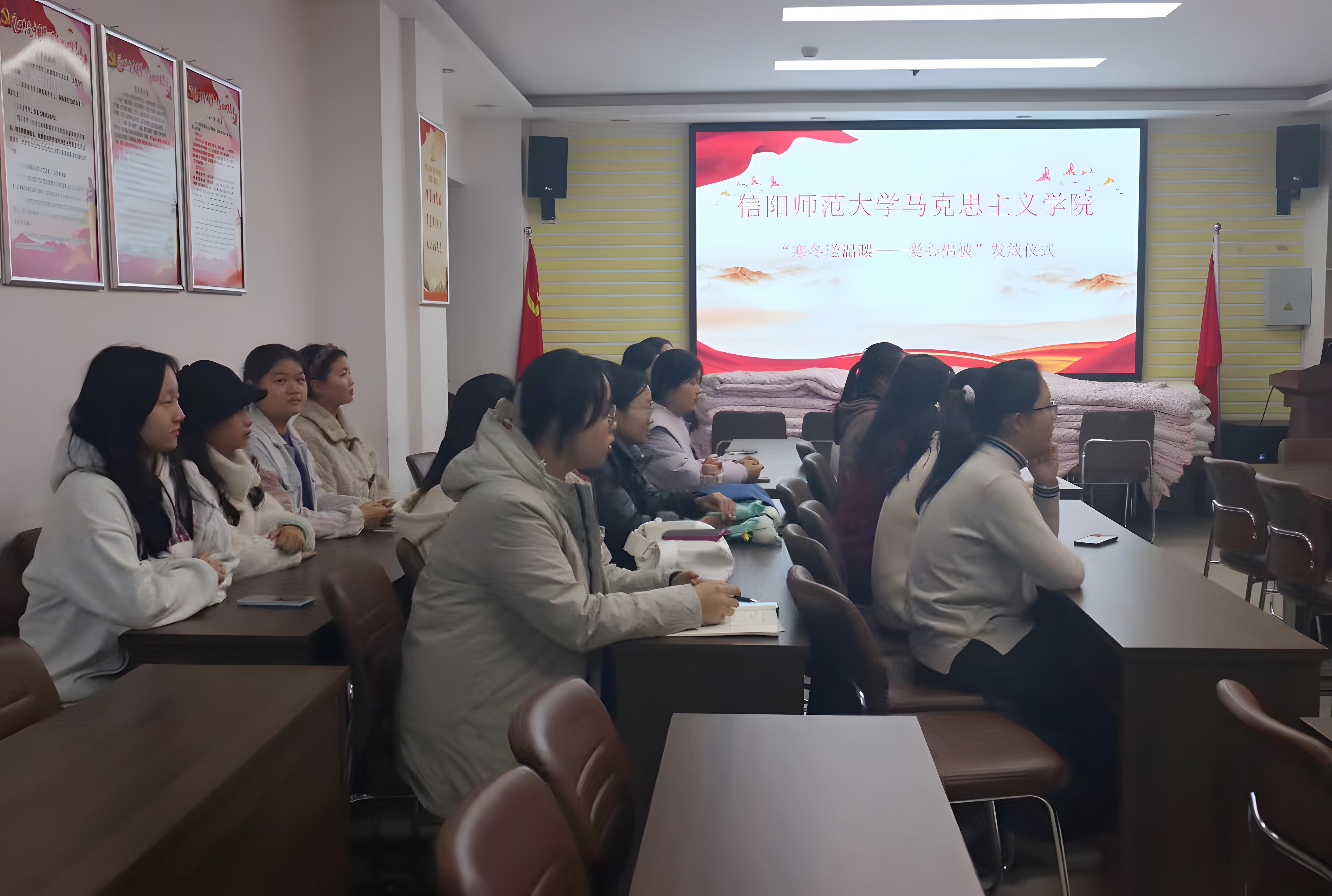为扎实做好学生资助工作,帮助贫困学子温暖过冬,12月8日下午,pp电子官方网站在社科楼323会议室举行爱心棉被发放仪式。pp电子官网党委副书记黄煌,团委老师高小佳、王明园以及受资助学生共同参加此次仪式。仪式由黄煌主持。