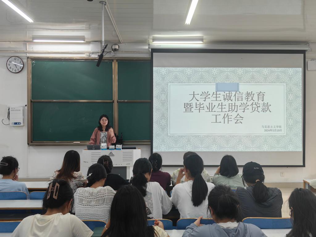 为深入贯彻国家助学货款“资助育人”精神,落实为学生“办实事、办好事、解难事”,根据学校2024年度国家助学贷款学生毕业确认工作安排,5月10日下午,pp电子官方网站在社科楼514教室召开了大学生诚信教育暨毕业生助学贷款工作会。马克思主义学院团委老师高小佳和2020级全体学生共同参加此次会议。会议由权益保障部负责人靳澍畅主持。