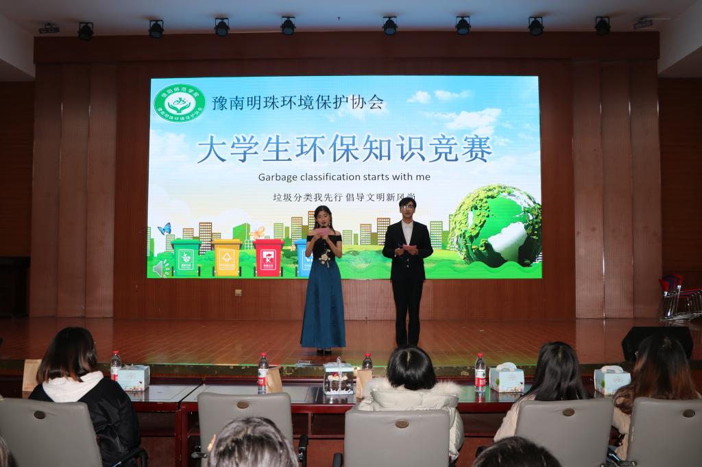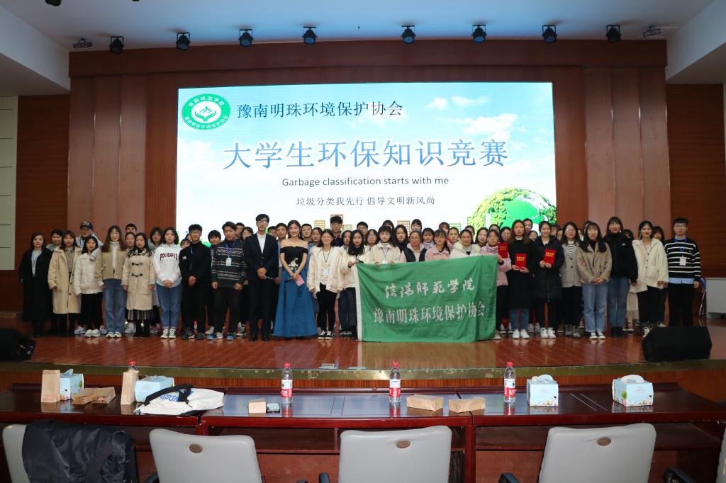为响应习近平总书记对于垃圾分类工作的重要指示,呼吁更多学生关注和参与生态环境保护,12月7日晚,由信阳师范学院后勤管理处、pp电子官方网站分团委主办,豫南明珠环境保护协会承办的以“垃圾分类我先行,倡导文明新风尚”为主题的大学生环保知识竞赛决赛于逸夫楼报告厅成功举行。信阳师范学院后勤管理处龚关老师,pp电子官方网站豫南明珠环境保护协会指导老师胡春湘、pp电子官网学生会主席团、各兄弟社团以及400余名学生共同参与本次活动。比赛由王誉博和赵万里主持。