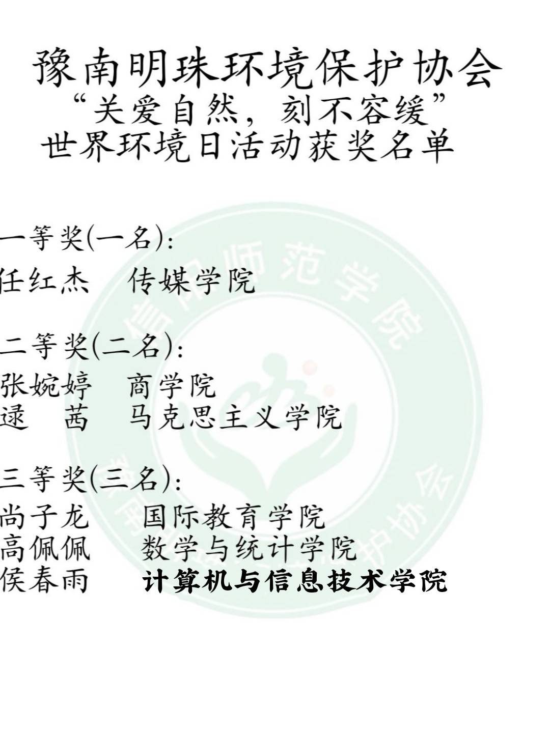 为增强学生的环保意识,培养学生的环保素养,6月8日—6月15日,由pp电子官方网站分团委主办,豫南明珠环境保护协会承办的以“关爱自然,刻不容缓”为主题的世界环境日活动于到梦空间线上平台顺利开展。