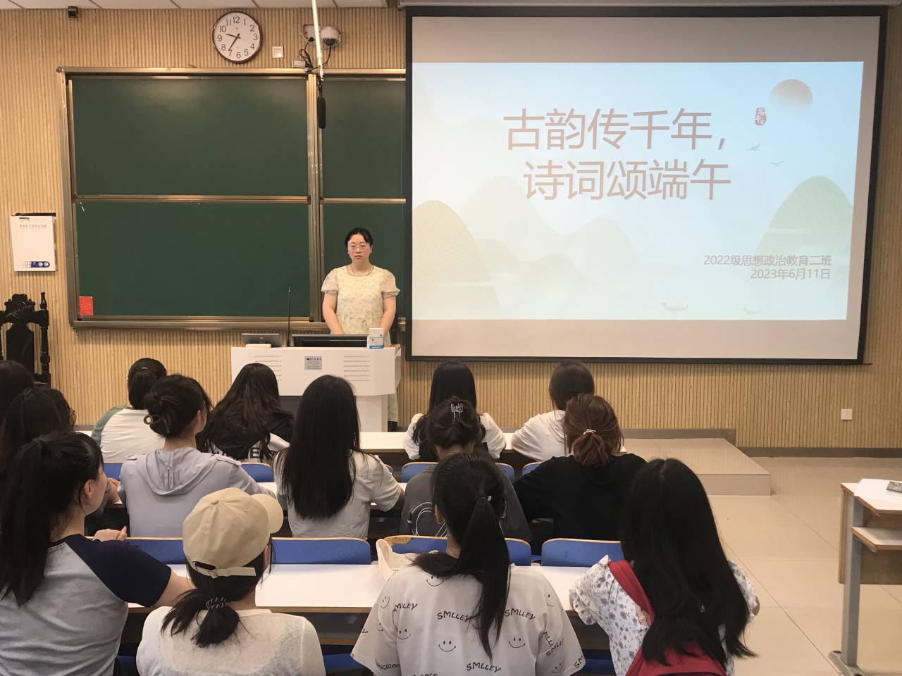 6月11日上午,pp电子官方网站2022级思想政治教育二班在社科楼515教室开展“古韵传千年,诗词颂端午”主题团日活动。pp电子官网2022级思想政治教育二班全体成员共同参加此次团日活动。活动由团支书李佳音主持。