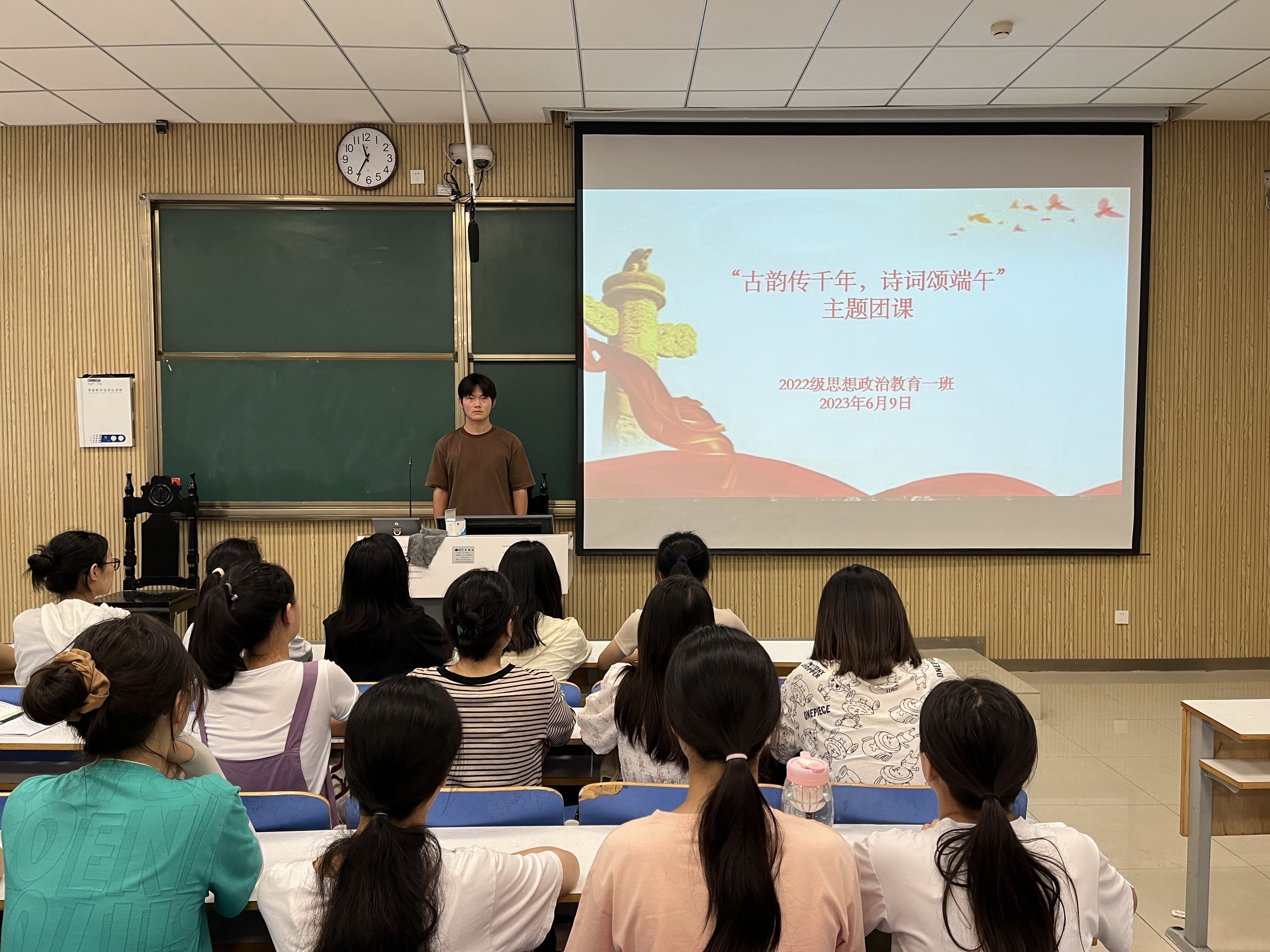 为进一步弘扬中华优秀传统文化,发挥传统节日在加强思想建设中的作用,6月9日上午,pp电子官方网站2022级思想政治教育一班在社科楼515教室召开“古韵传千年,诗词颂端午”主题团课,2022级思想政治教育一班全体同学共同参与本次团课,团课由团支部副书记闻炎仲主持。