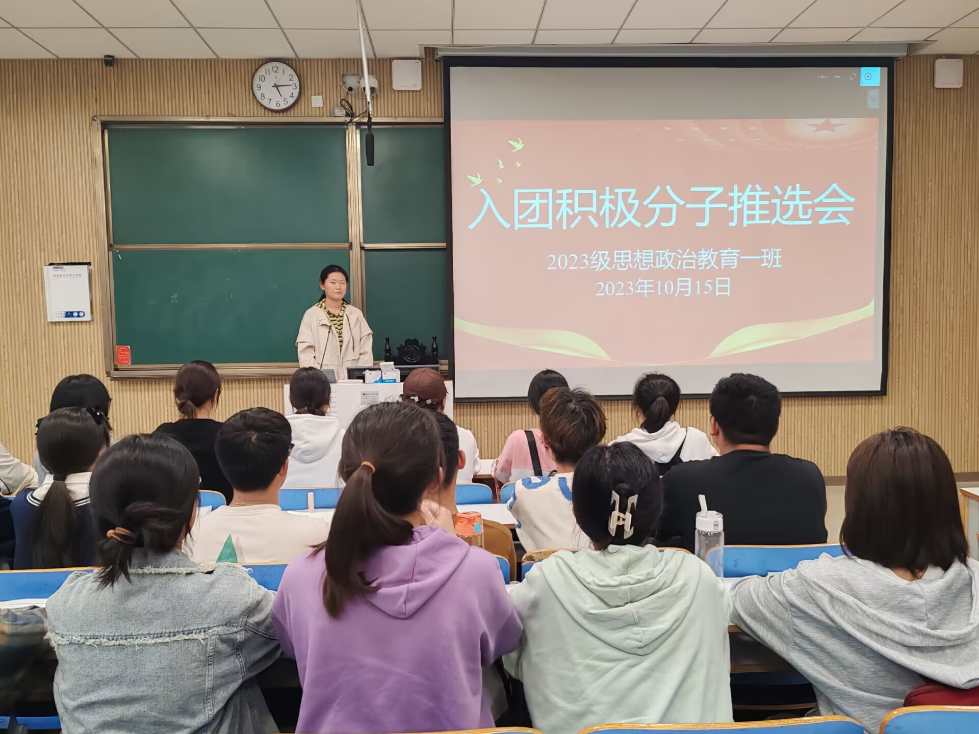 为进一步加强团组织建设,增强团支部的凝聚力,积极开展团青工作,10月15日下午,pp电子官方网站2023级思想政治教育一班在社科楼514教室召开入团积极分子推选班会。pp电子官网2023级思想政治教育一班全体同学共同参与本次班会,班会由团支书张卓主持。