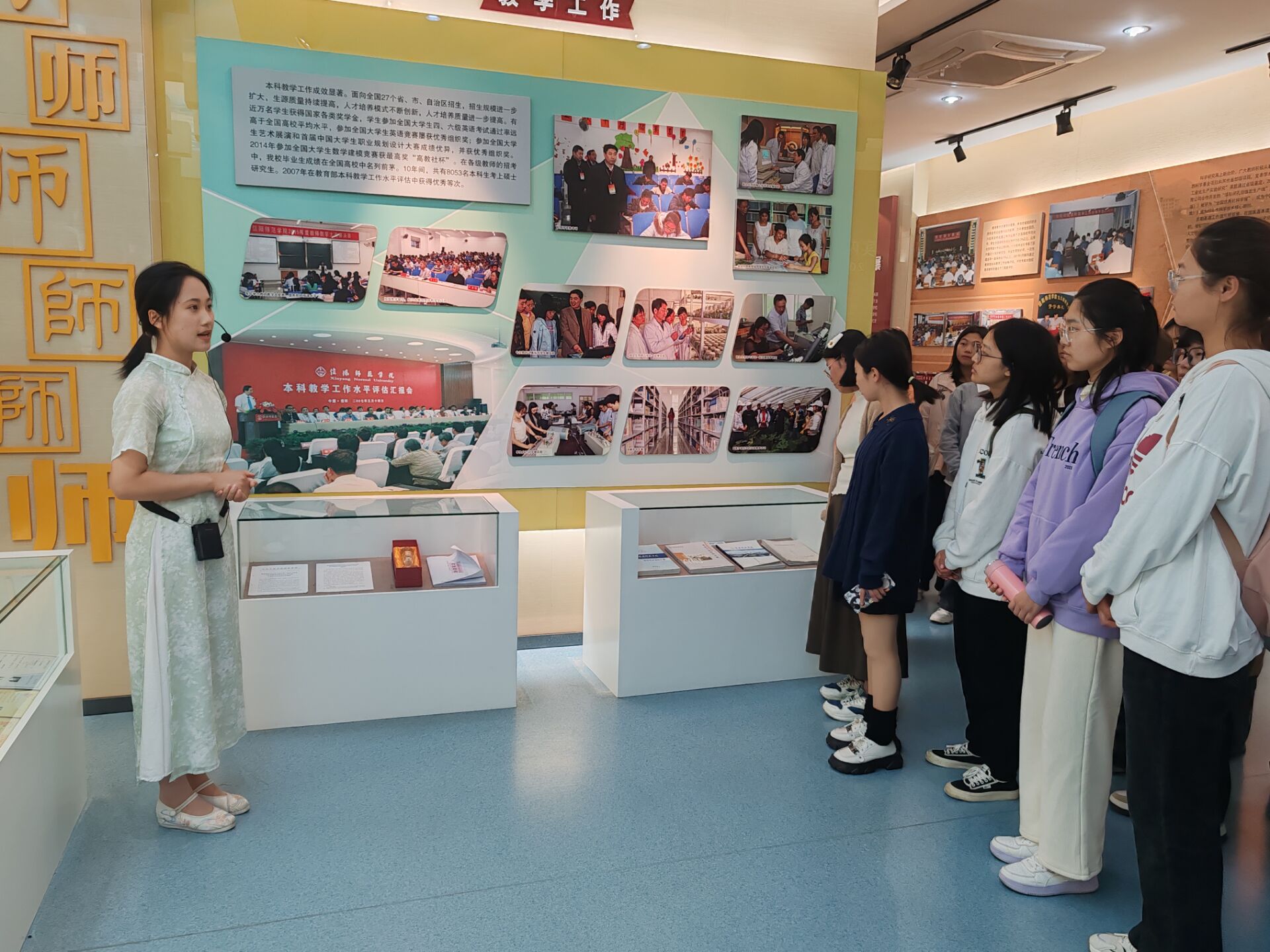 国以史为鉴,校以史明德。校史馆以实物、图片、文字、影像等展示学校的历史与成就。步入序厅,一座恢弘的展板将学校的历史沿革和发展变迁娓娓道来。从一代代师大人接续奋斗、为强校建设不断奋斗的人物照片到琳琅满目的党建、科研、教学成果,满载学校历史的照片墙和实物一一展现在大家面前。在讲解员的带领下,同学们走过一个个深刻呈现了我校美好过往的专题展区。这些专题展区深刻地再现了我校四十多的风雨沧桑,四十多年的栉风沐雨。四十多年间,一代代信师人薪火相传、砥砺奋进,历经一系列的风雨变迁,成就了今天的信阳师范大学。面对我校当今所取得的一系列成就,同学们纷纷露出了自豪的微笑。