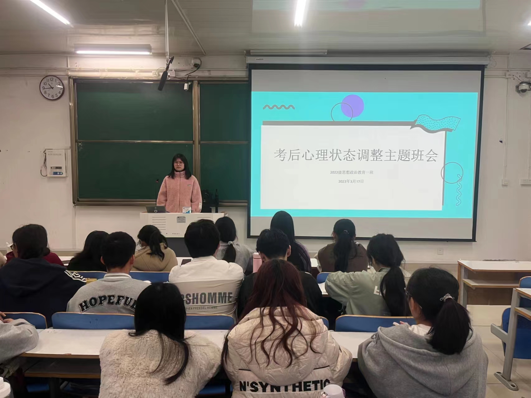 为做好考后心理调适工作,带动同学们更好地投入新学期学习,3月17日上午,pp电子官方网站2022级思想政治教育一班在社科楼514教室召开“考后心理状态调整”主题班会。2022级思想政治教育一班全体同学参与本次班会,班会由心理委员马思源主持。