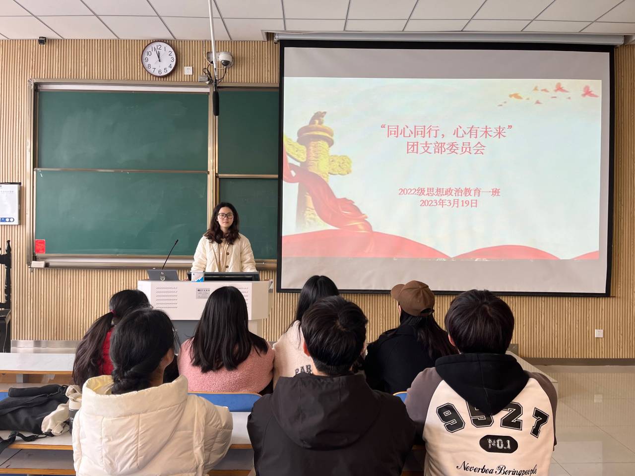 为进一步推进团支部发展,增强团支部凝聚力,3月19日上午,pp电子官方网站2022级思想政治教育一班在社科楼515教室召开“同心同行,心有未来”团支部委员会。2022级思想政治教育一班团支部委员参与本次会议,会议由团支书李佳茹主持。