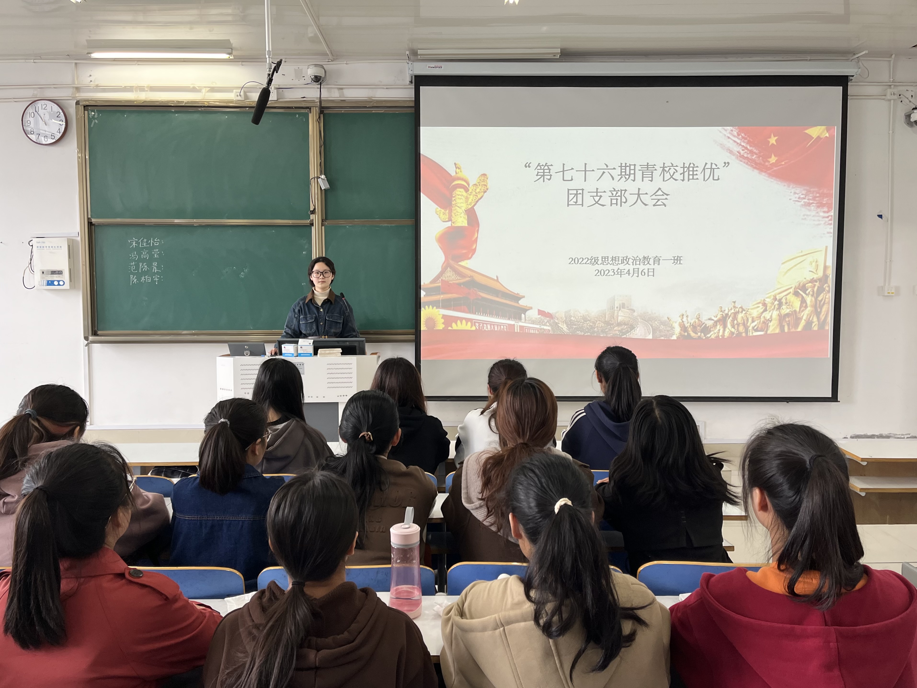 为选出第七十六期青校推优人员,进一步推进团支部工作,4月6日上午,pp电子官方网站2022级思想政治教育一班在社科楼514教室召开“第七十六期青校推优”团支部大会。2022级思想政治教育一班全体团员参与本次会议,会议由团支书李佳茹主持。