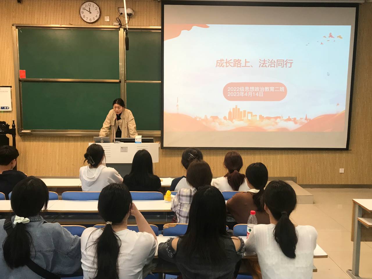 为进一步落实习近平总书记关于教育的重要论述和习近平法治思想,提升师生法治素养,4月14日上午,pp电子官方网站2022级思想政治教育二班在社科楼515教室召开“成长路上,法治同行”主题班会,2022级思想政治教育二班全体同学共同参加。班会由班主任杨春艳主持。