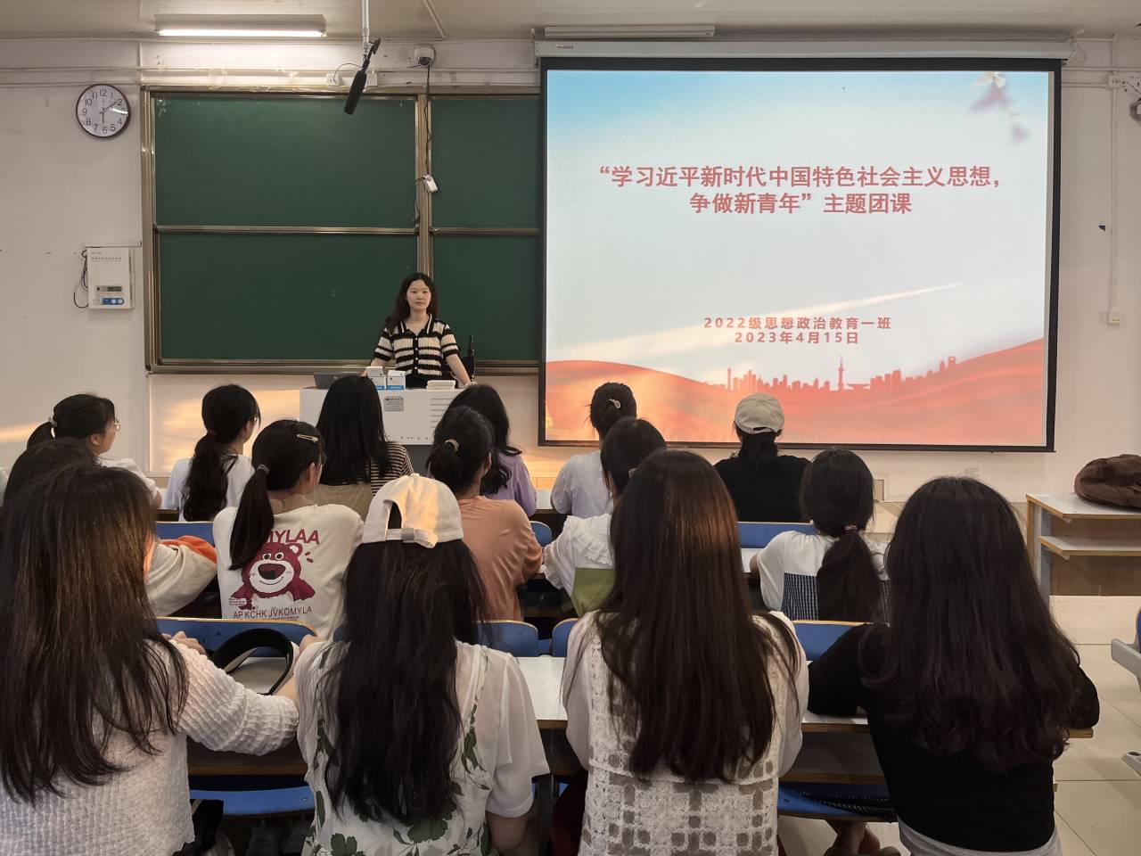 为深入贯彻落实习近平新时代中国特色社会主义思想,加强团支部思想建设,4月15日下午,pp电子官方网站2022级思想政治教育一班在社科楼514教室召开“学习近平新时代中国特色社会主义思想,争做新青年”主题团课。2022级思想政治教育一班全体同学共同参与本次团课,团课由团支书李佳茹主持。