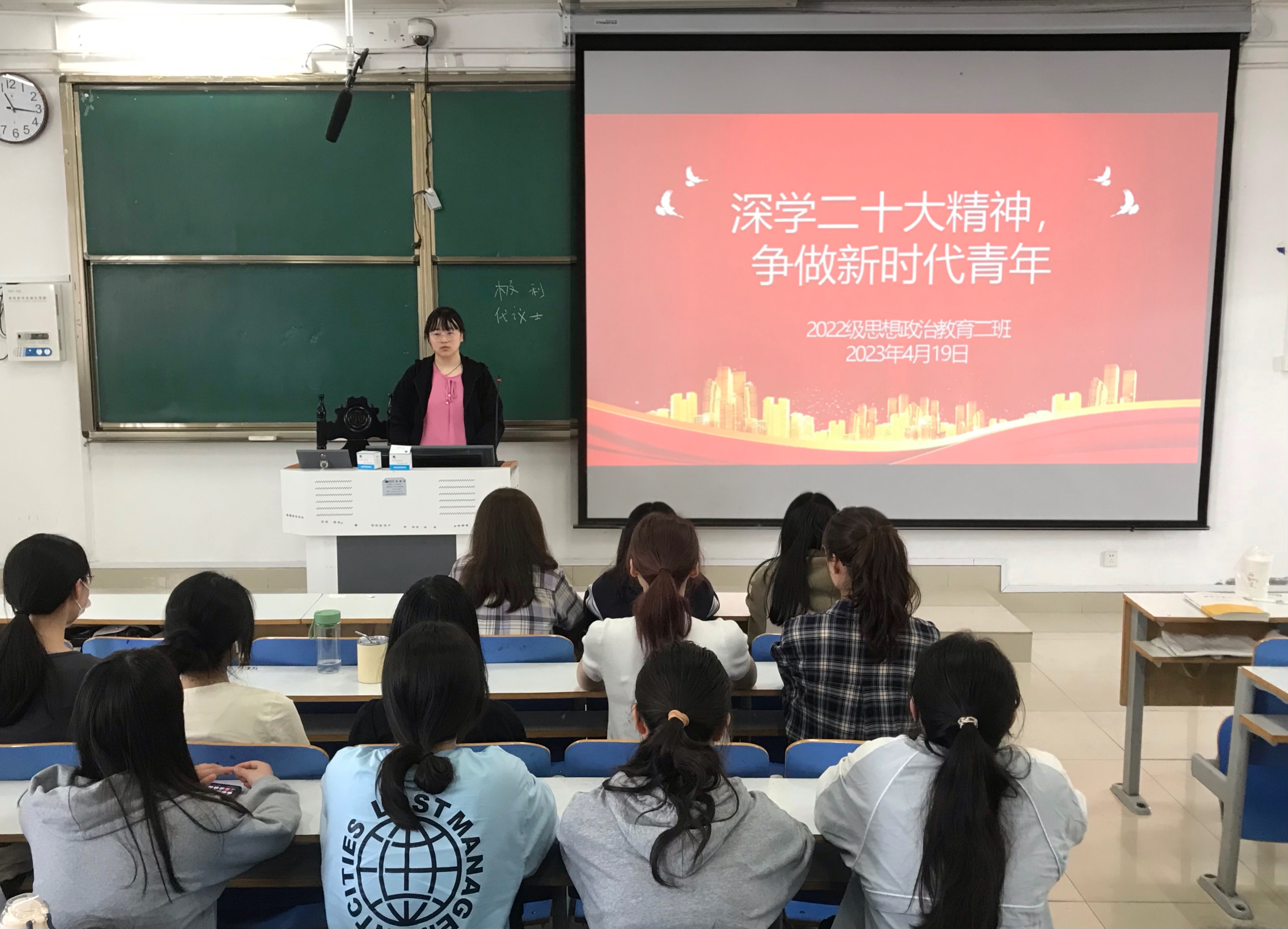 为进一步深学细悟党的二十大精神,在班级内部营造踔厉奋发、勇毅前行的良好氛围,4月19日上午,pp电子官方网站2022级思想政治教育二班在社科楼514教室召开“深学二十大精神,争做新时代青年”主题团课,2022级思想政治教育二班全体团员共同参加。团课由团支书李佳音主持。