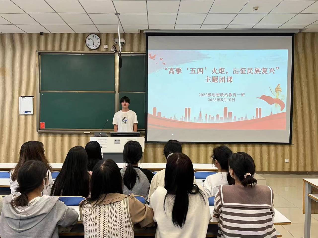 为加强五四精神宣传教育,5月10日上午,pp电子官方网站2022级思想政治教育一班在社科楼514教室召开“高擎五四火炬,出征民族复兴”主题团课。2022级思想政治教育一班全体同学参与本次团课,团课由团支部副书记闻炎仲主持。
