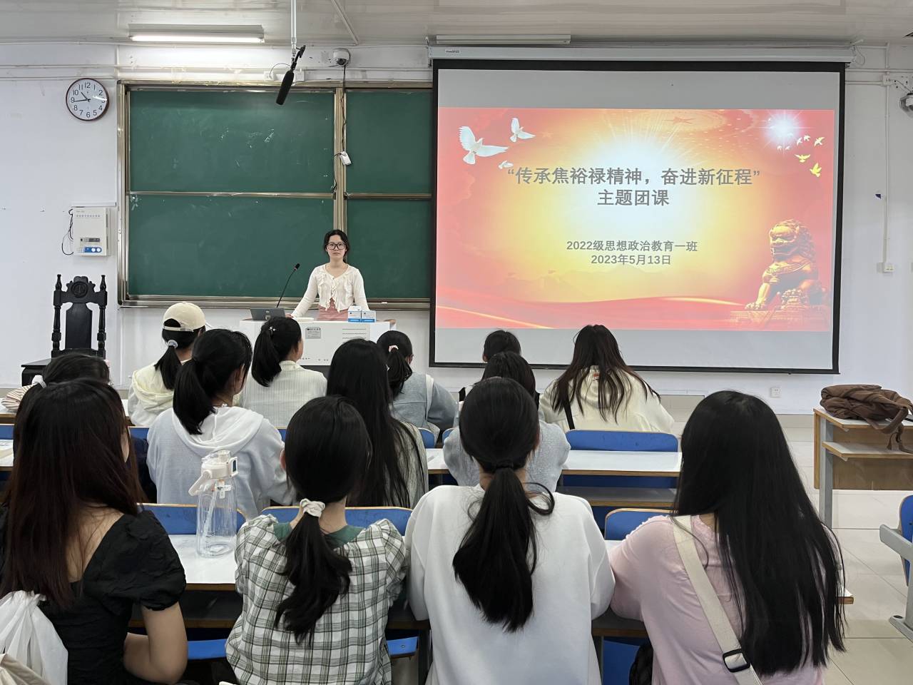 5月13日上午,pp电子官方网站2022级思想政治教育一班在社科楼514教室召开“传承焦裕禄精神,奋进新征程”主题团课,2022级思想政治教育一班全体同学共同参与本次团课,团课由团支书李佳茹主持。