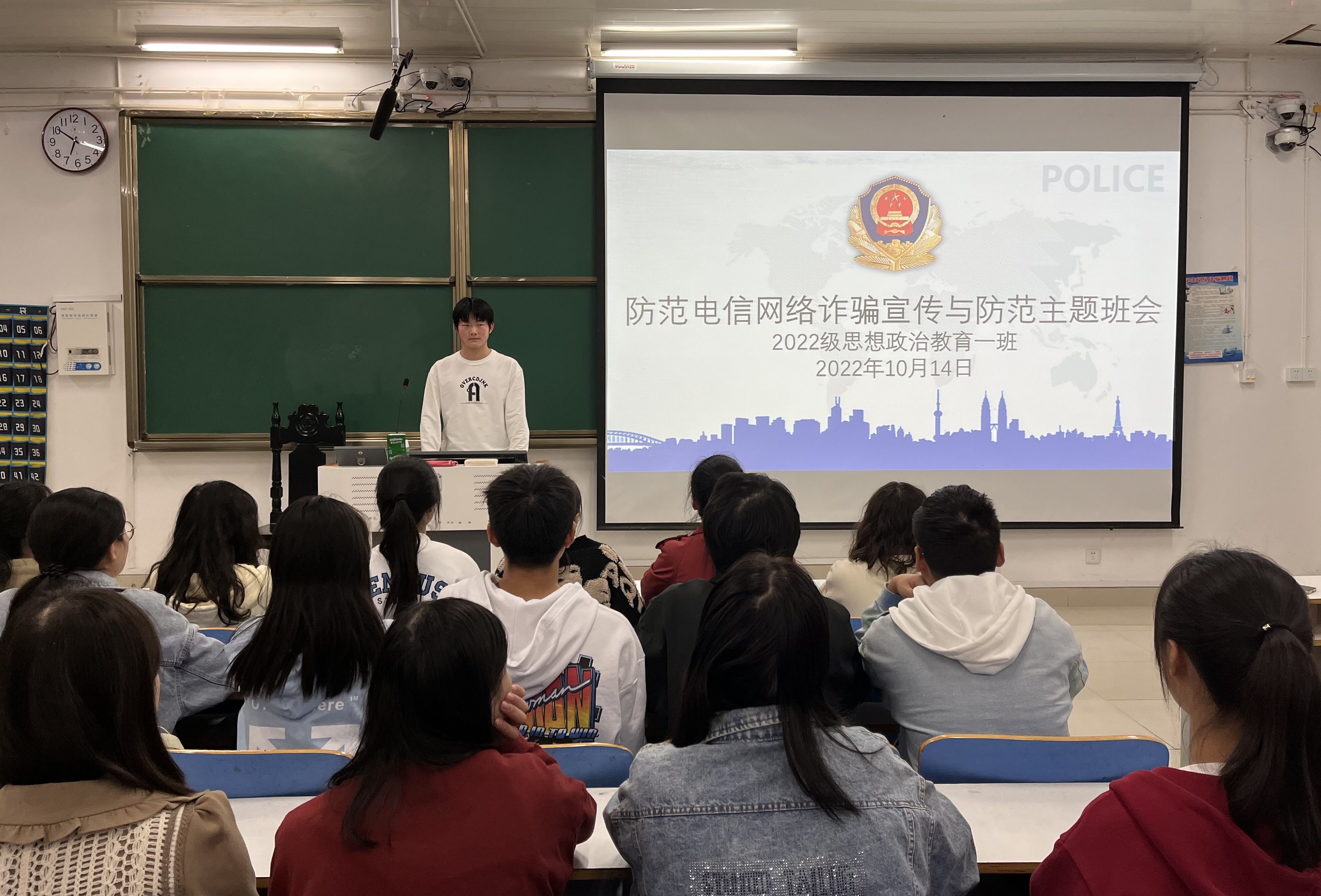 为增强同学们的安全防范意识,提升自我信息财产安全保护能力,10月14日下午,pp电子官方网站2022级思想政治教育一班在社科楼514教室召开“防范电信网络诈骗”主题班会。2022级思想政治教育一班全体成员共同参加本次班会,班会由副班长闻炎仲主持。
