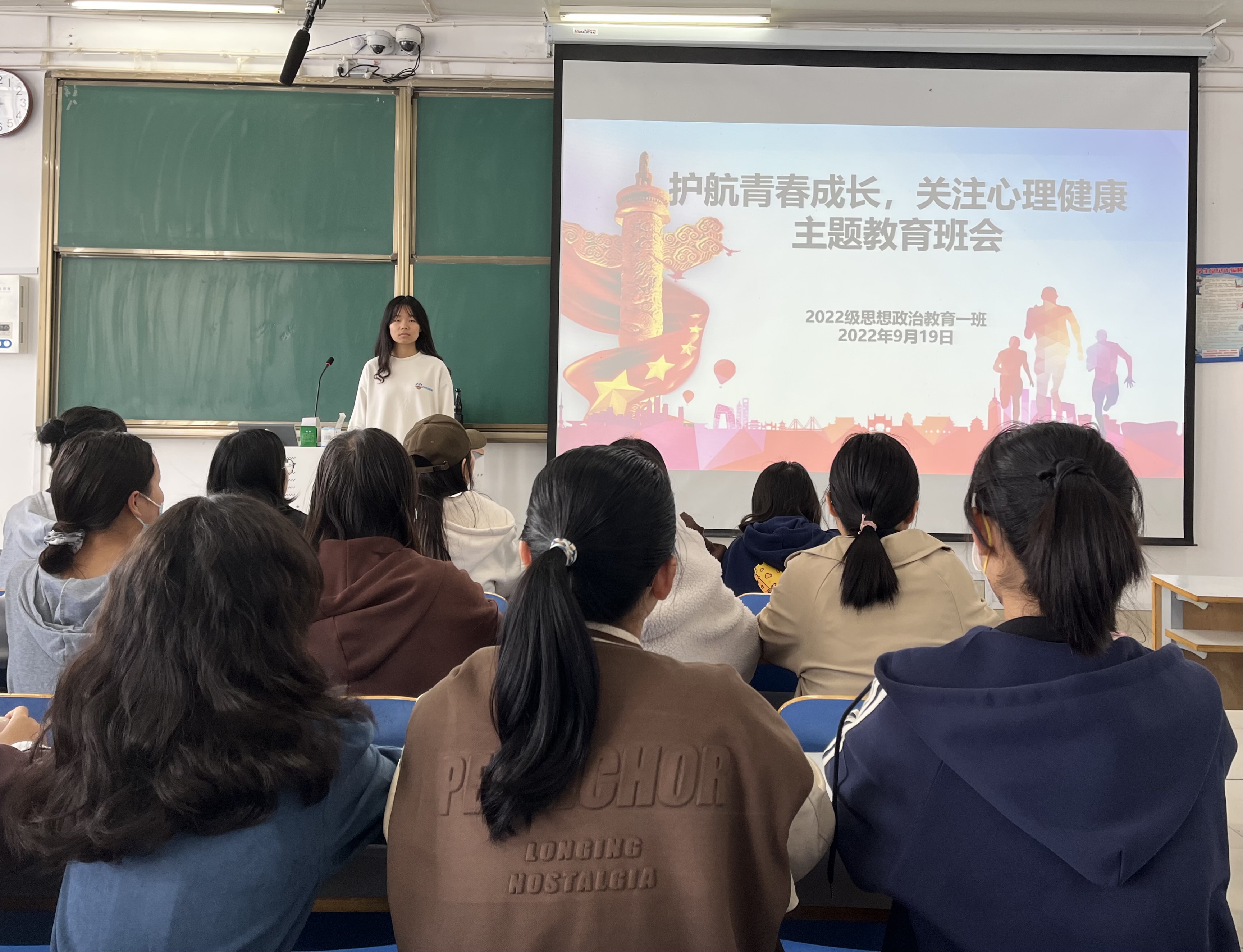 为普及心理健康知识,提升同学们的心理素质,10月24日下午,pp电子官方网站2022级思想政治教育一班在社科楼514教室召开“护航青春成长,关注心理健康”主题班会。2022级思想政治教育一班全体同学参与本次班会,班会由劳动委员孙怡果主持。