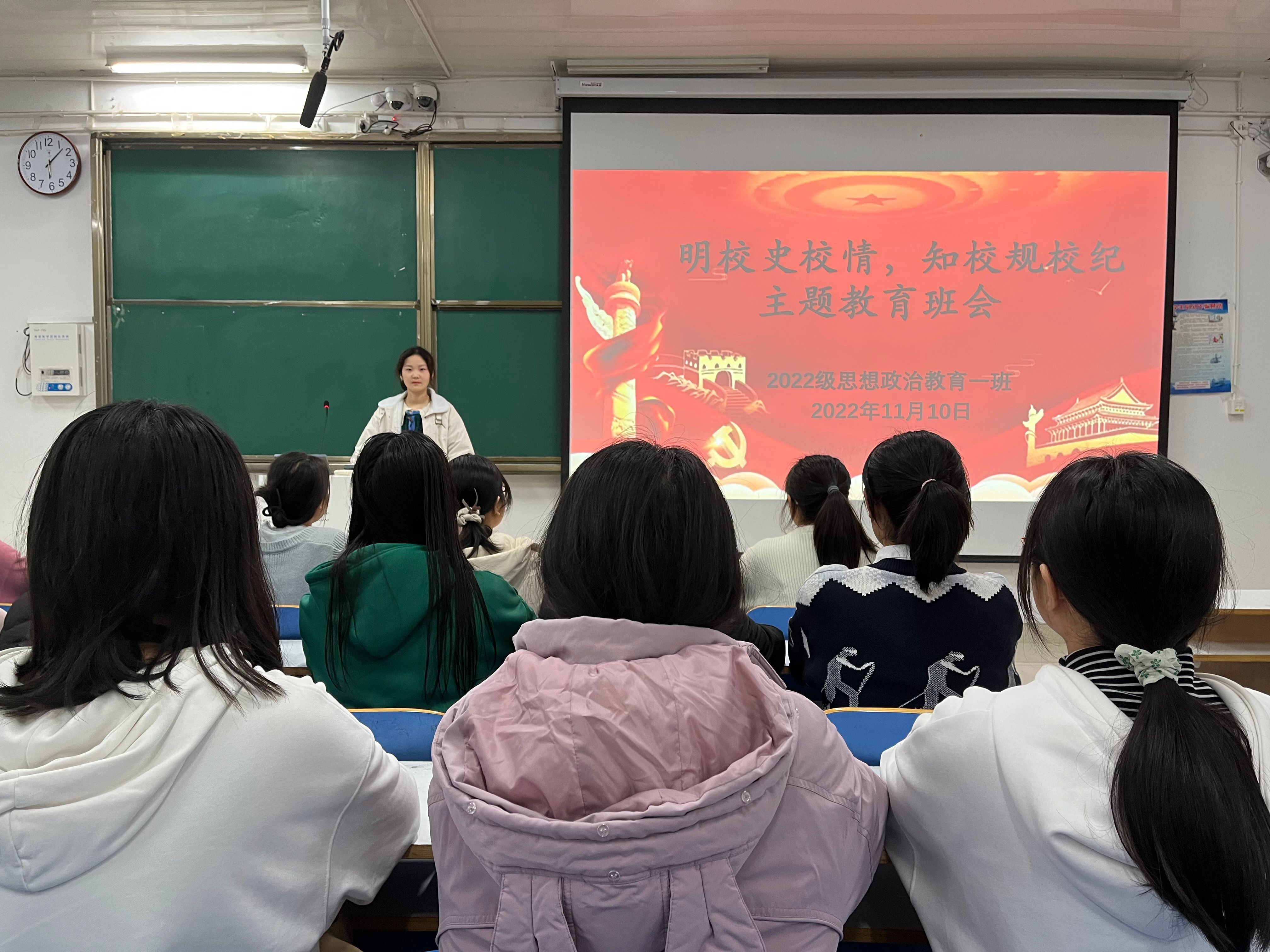 为加强同学们对校史的了解,坚定理想信念,11月10日下午,pp电子官方网站2022级思想政治教育一班在社科楼514教室召开 “明校史校情,知校规校纪”主题班会。2022级思想政治教育一班全体同学参与本次班会,班会由团支书李佳茹主持。