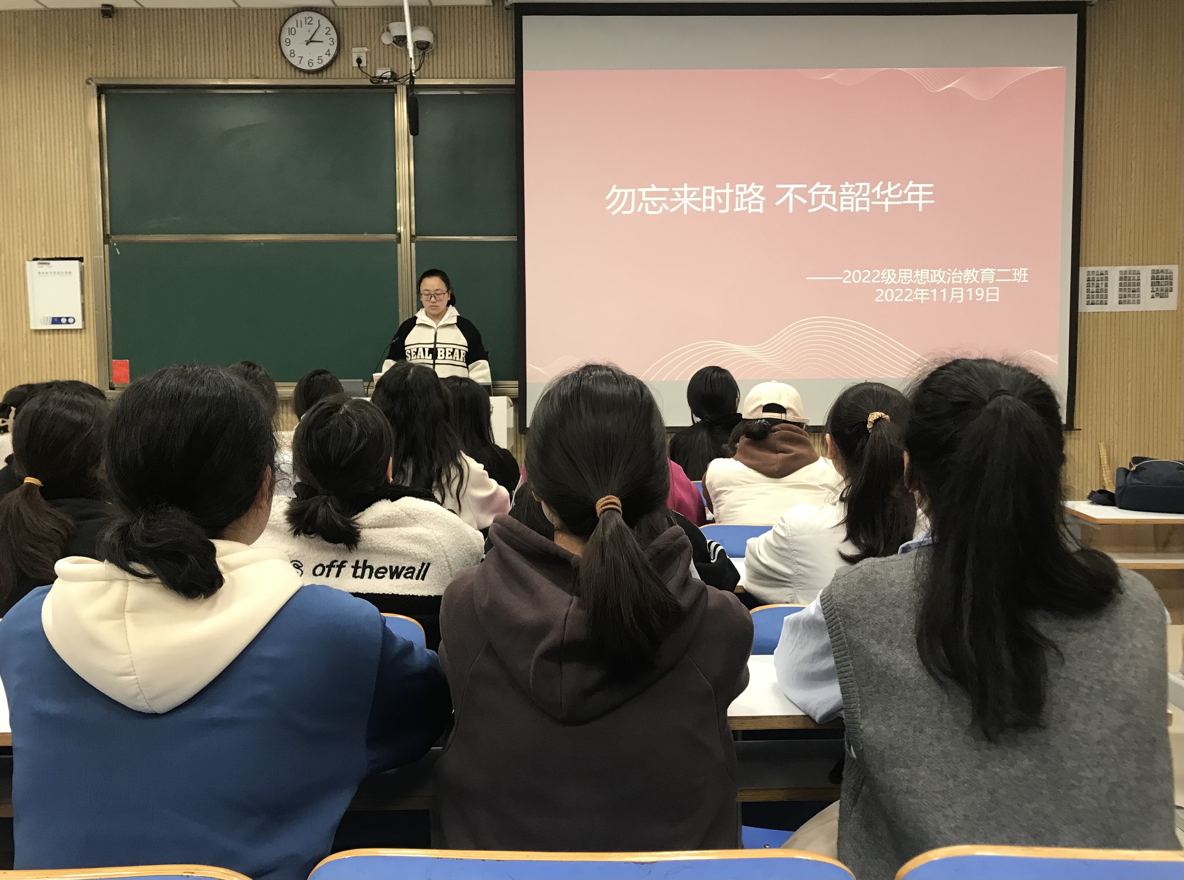 为进一步激发大学生的爱国情怀、凝聚奋进力量,11月19日下午,pp电子官方网站2022级思想政治教育二班在社科楼515教室召开“勿忘来时路 不负韶华年”主题班会。2022级思想政治教育二班全体同学共同参加会议。本次会议由团支书李佳音主持。