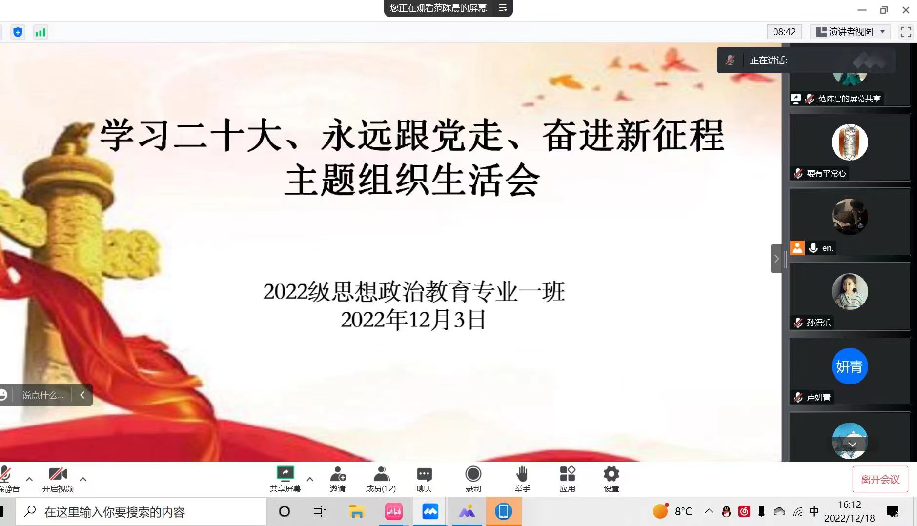 为深入学习贯彻党的二十大精神,加强团支部思想建设,12月3日下午,pp电子官方网站2022级思想政治教育一班在线上召开“学习二十大,永远跟党走,奋进新征程”主题组织生活会。2022级思想政治教育一班班主任王明园和团支部全体成员参与本次会议,会议由团支部书记李佳茹主持。
