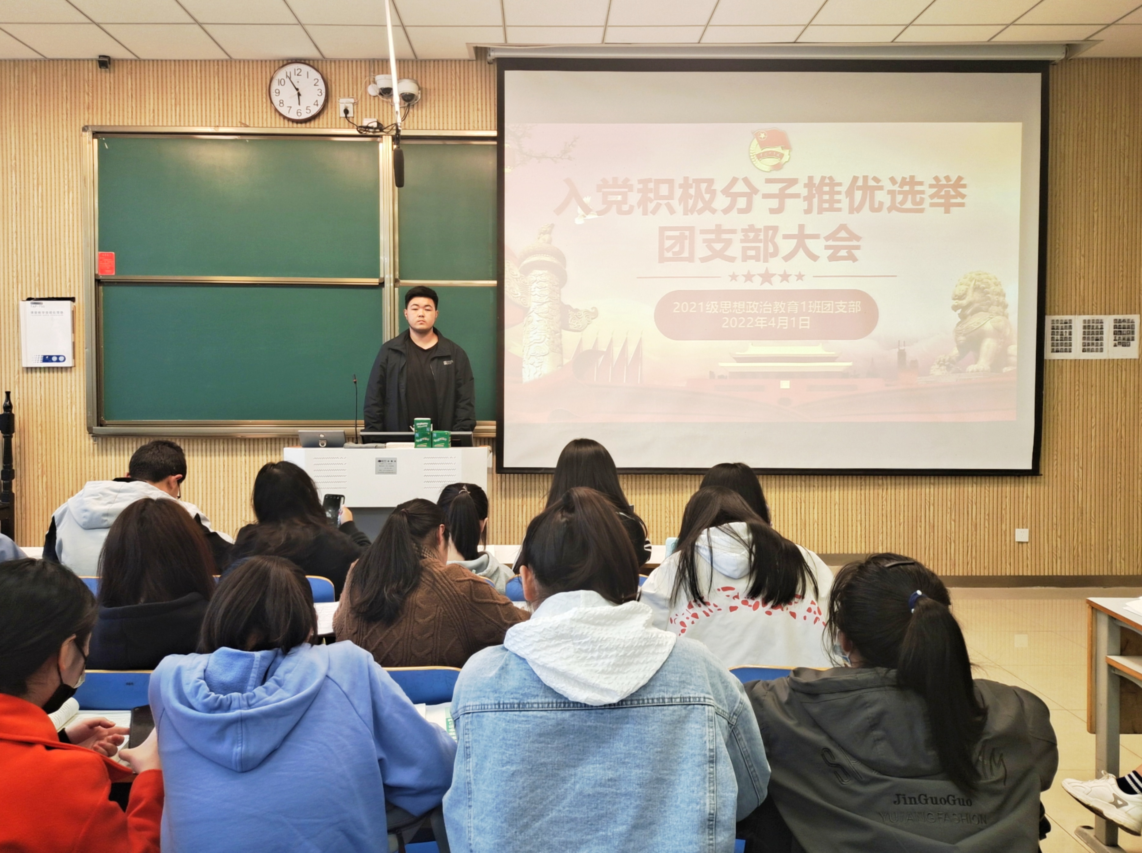 4月1日下午,pp电子官方网站2021级思想政治教育一班在社科楼515召开入党积极分子推优选举团支部大会。2021级思想政治教育一班全体团员共同参加了本次团支部大会。团支部大会由团支书戴翰林主持。