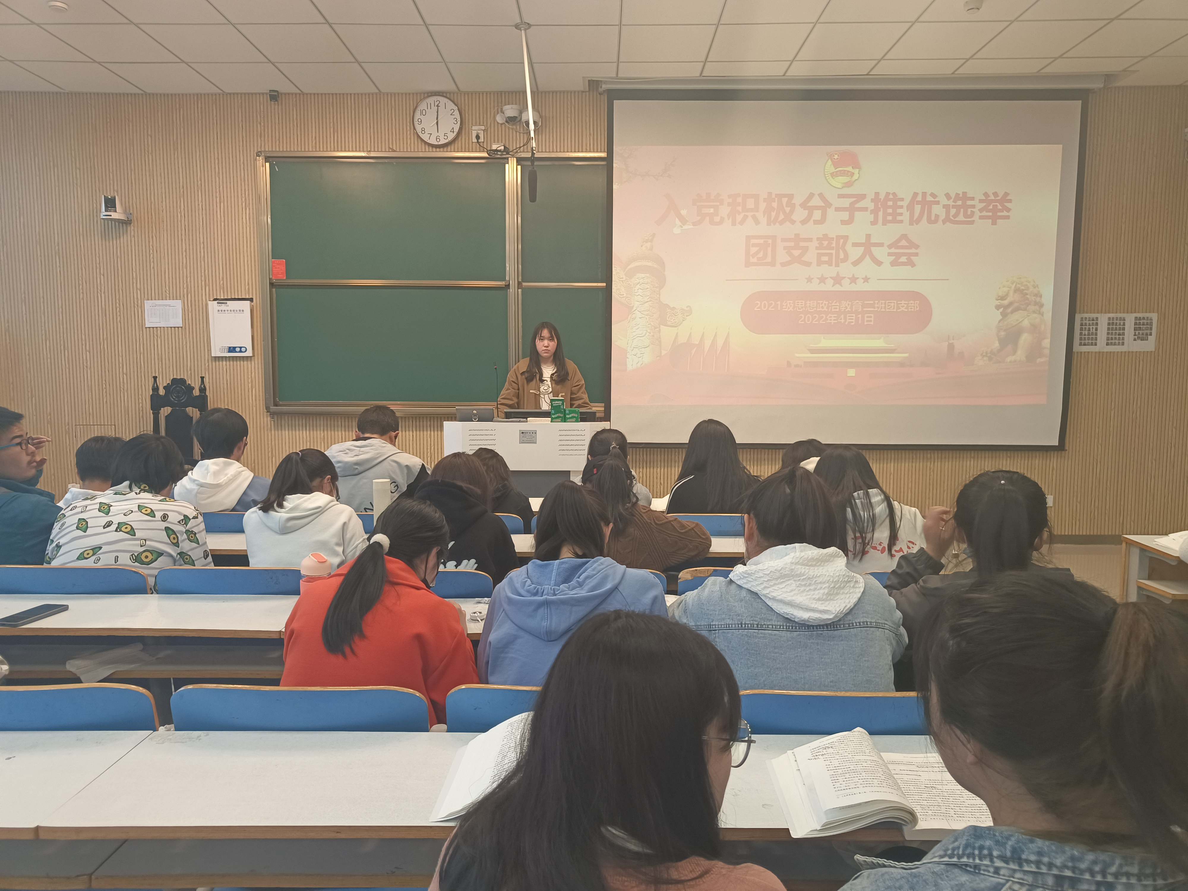 4月1日下午,pp电子官方网站2021级思想政治教育二班在社科楼515教室召开入党积极分子推优选举团支部大会。2021级思想政治教育二班全体团员参与此次团支部大会,团支部大会由团支书王婧欣主持。