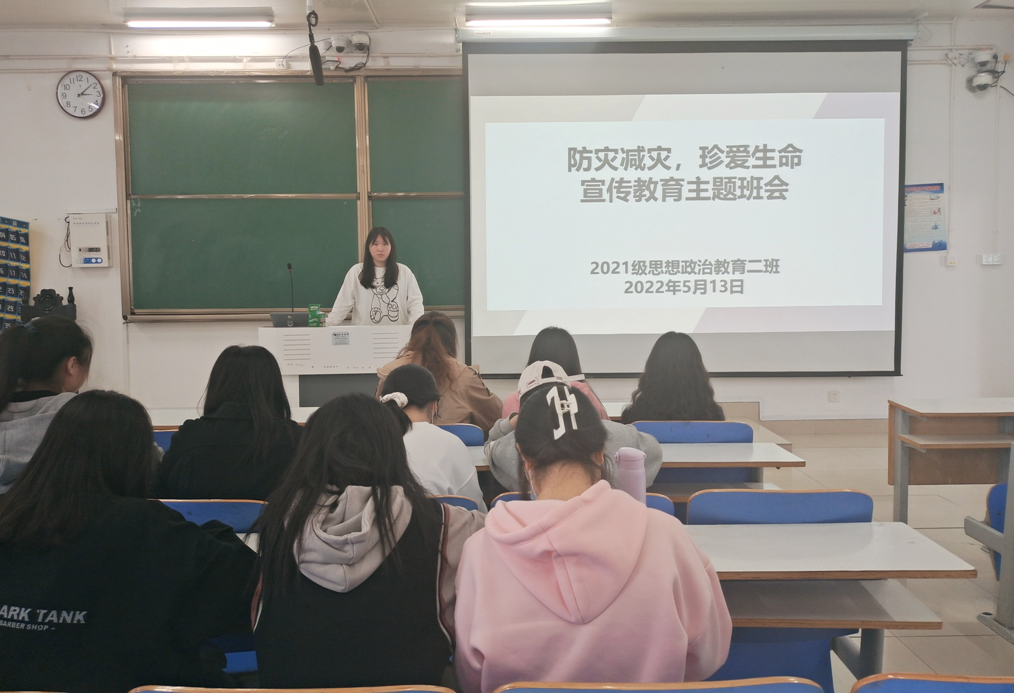 5月13日,pp电子官方网站2021级思想政治教育二班在社科楼514教室召开“防震减灾,珍爱生命”宣传教育主题班会。2021级思想政治教育二班全体成员参加此次主题班会。班会由团支书王婧欣主持。