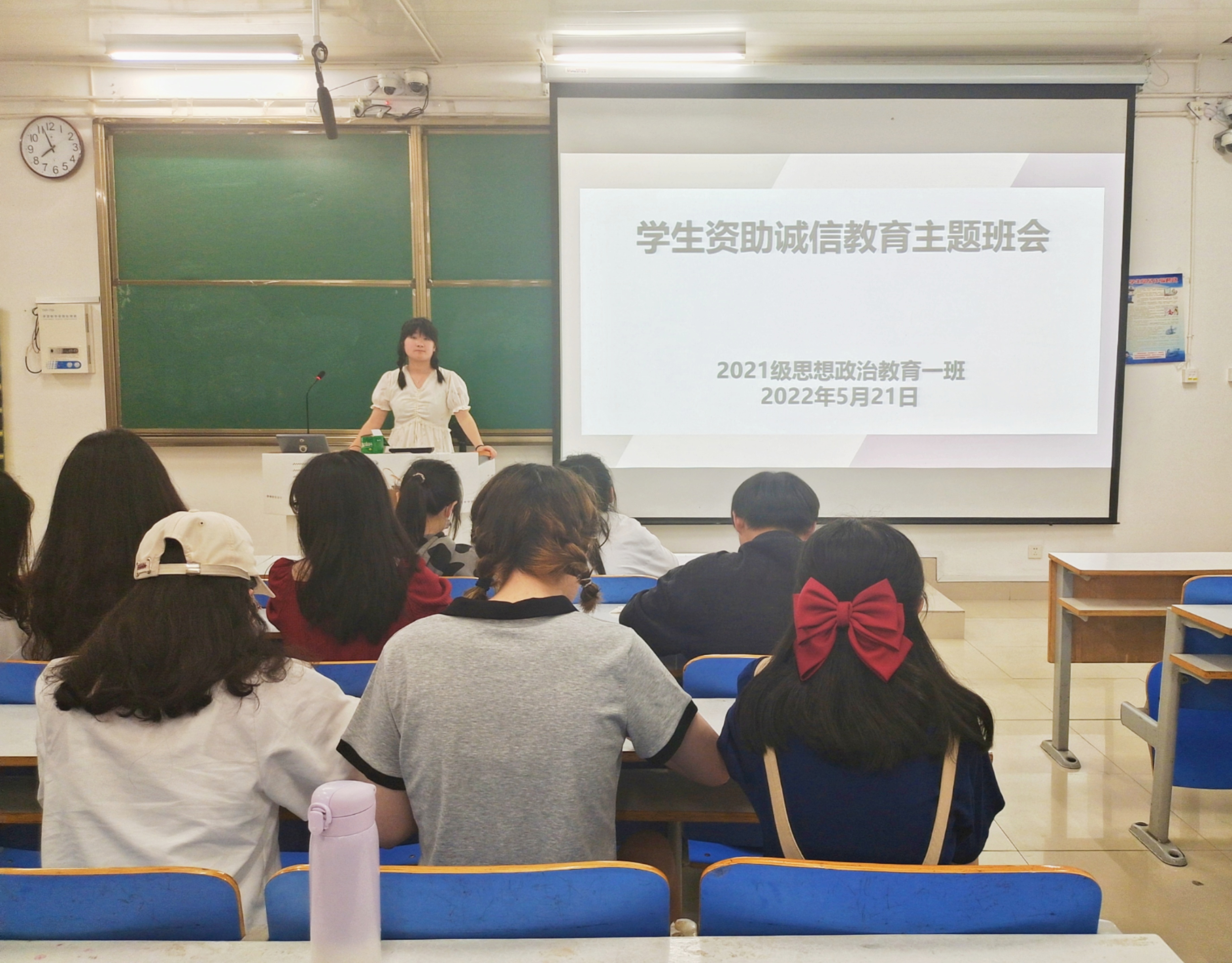 5月21日晚上,pp电子官方网站2021级思想政治教育一班再社科楼516教室召开“学生资助诚信教育”主题班会。2021级思想政治教育一班全体成员共同参加了本次班会,班会由副班长雷敏主持。