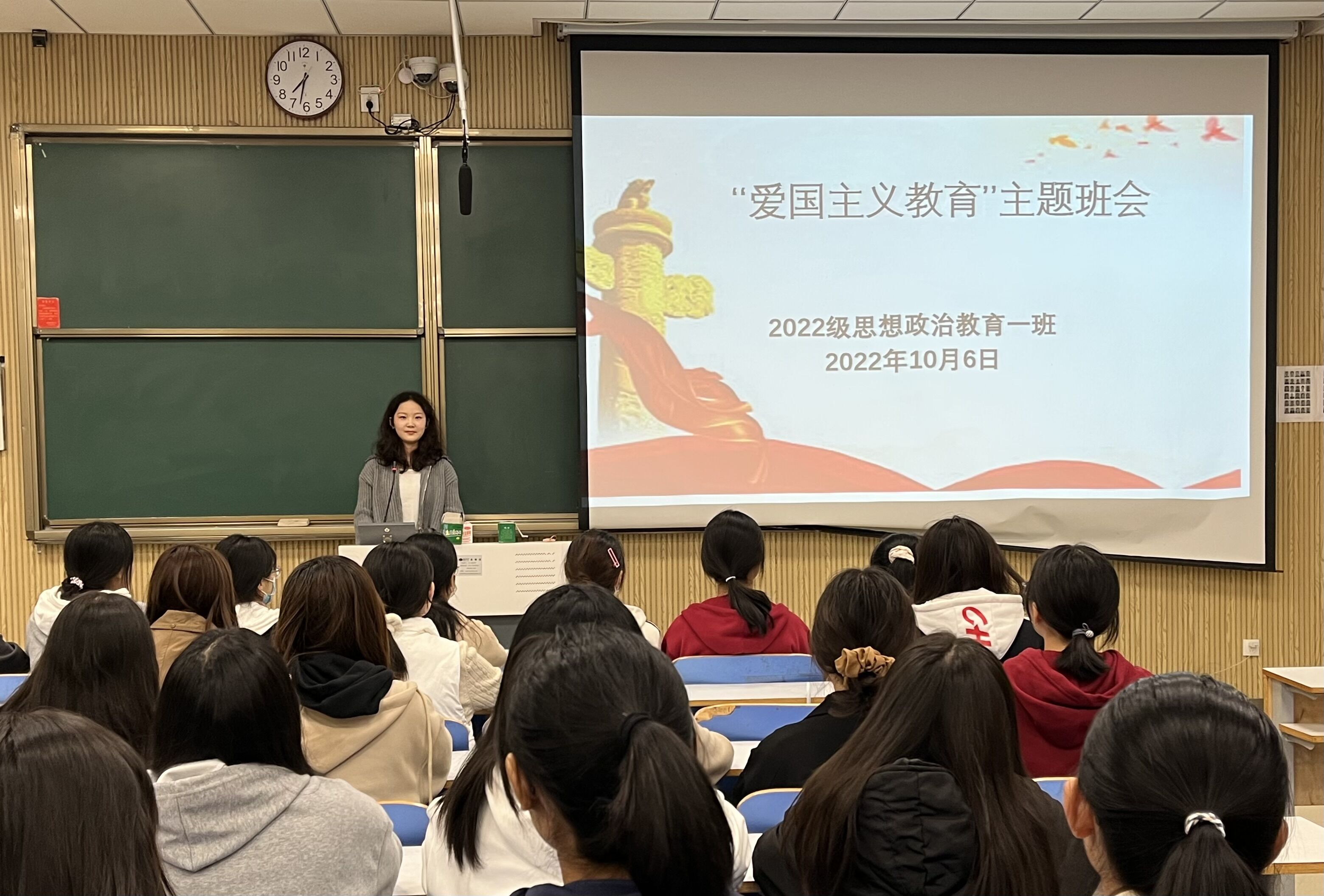 为增强同学们的爱国意识,弘扬爱国主义文化,10月6日下午,pp电子官方网站2022级思想政治教育一班在社科楼515教室召开“爱国主义教育”主题班会。2022级思想政治教育一班全体成员共同参加本次班会,班会由团支书李佳茹主持。