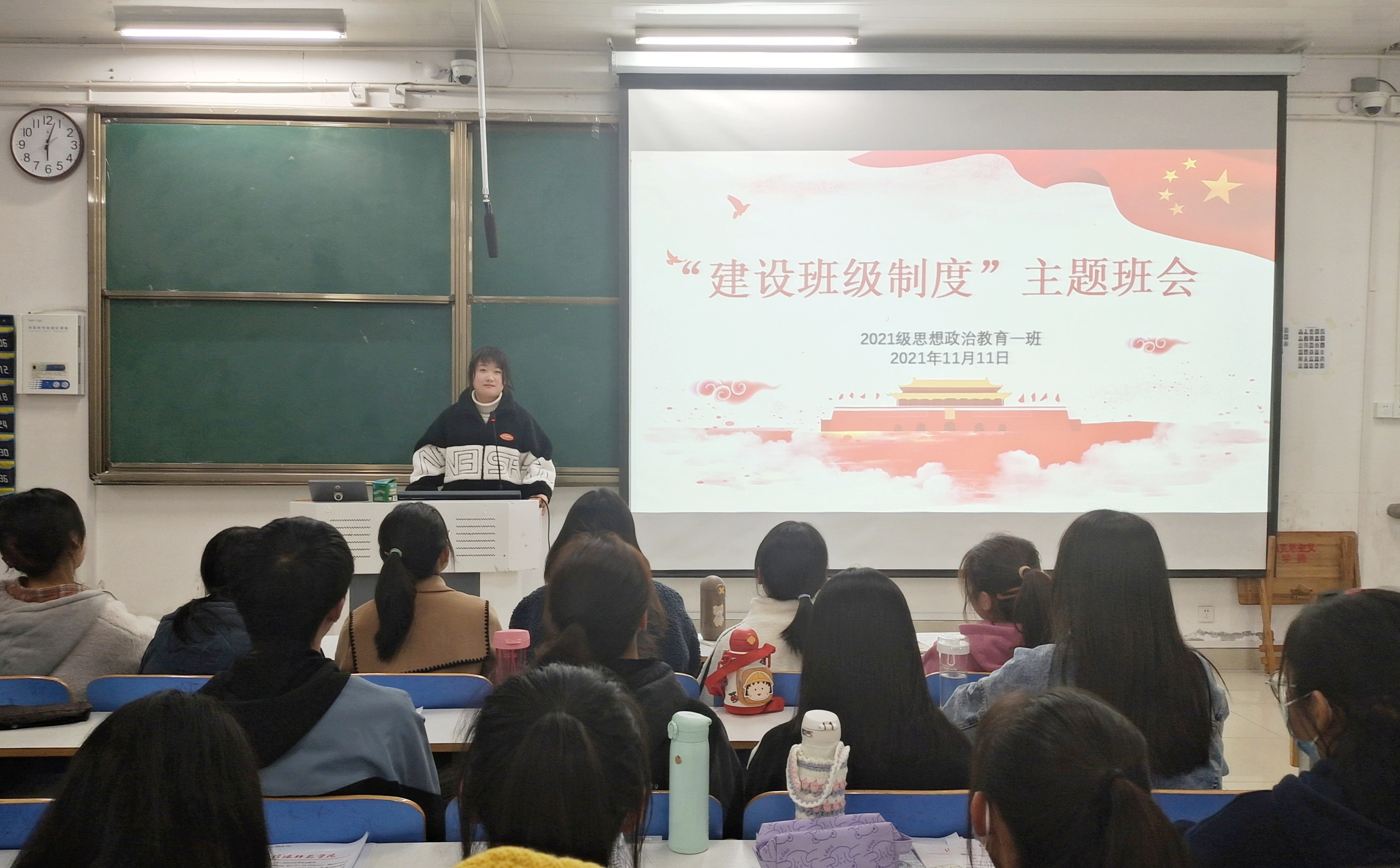 为了打造一个井然有序、遵纪守约的文明班集体。11月11日下午,pp电子官方网站2021级思想政治教育一班在社科楼516教室召开“建设班级制度”主题班会。2021级思想政治教育一班全体成员参加了本次班会。班会由副班长雷敏主持。