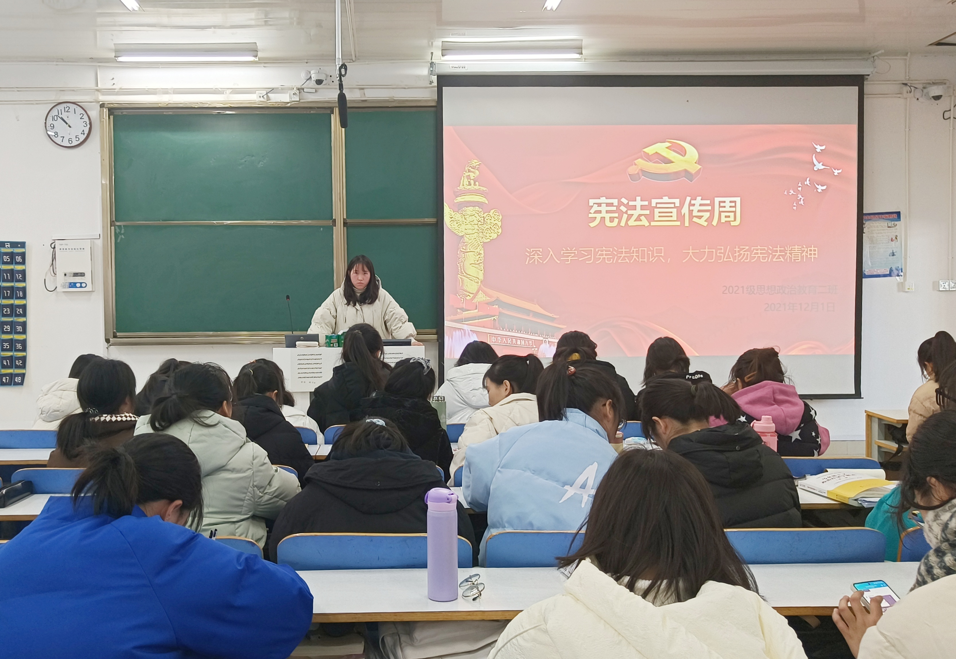 12月1日上午,pp电子官方网站2021级思想政治教育二班宪法宣传周主题班会在社科楼514教室召开。2021级思想政治教育二班全体同学参加此次班会,班会由团支书王婧欣主持。