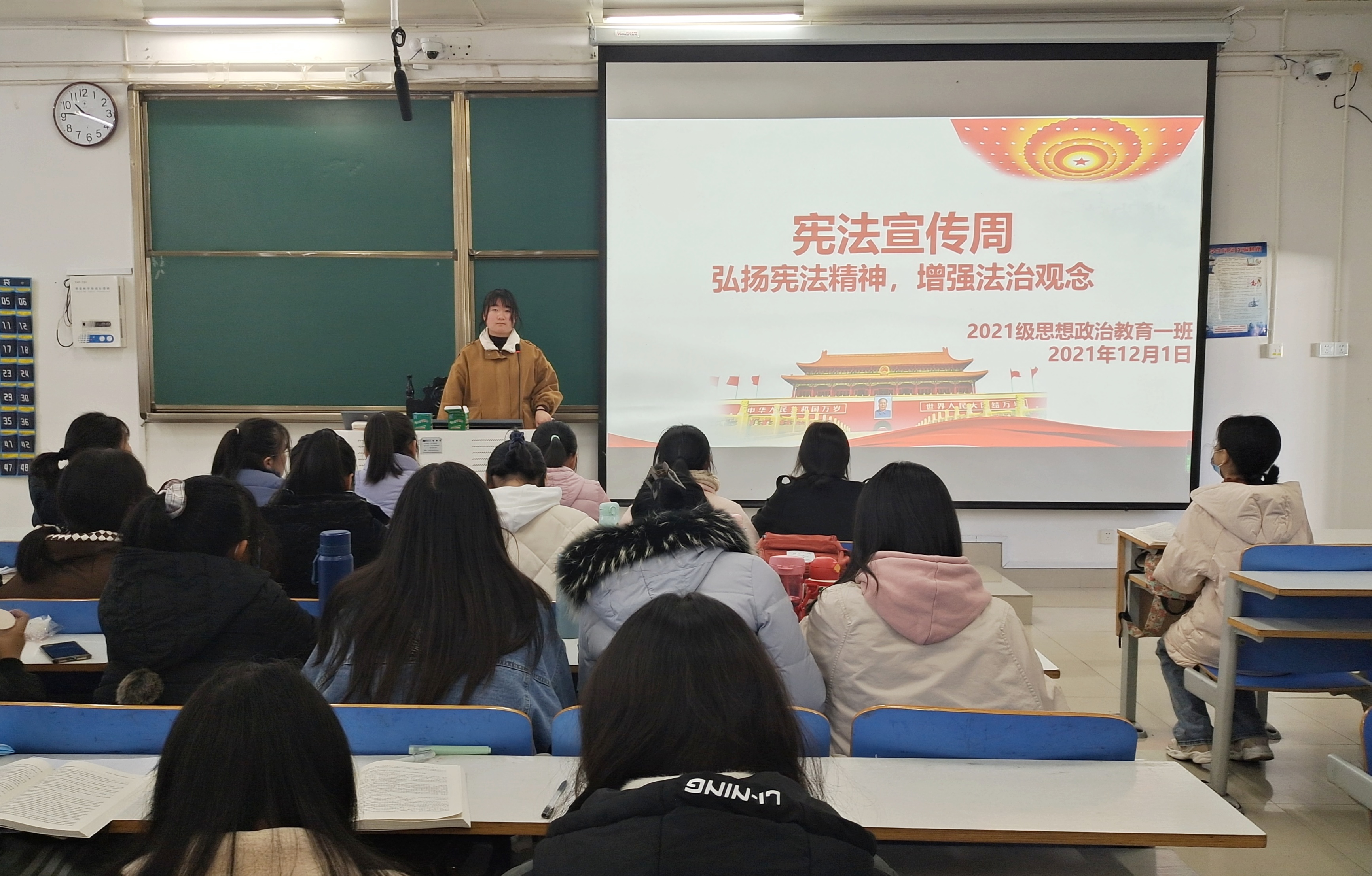 为增强同学们的法治观念,学习贯彻宪法精神,12月1日上午,pp电子官方网站2021级思想政治教育一班在社科楼514教室召开“弘扬宪法精神,增强法治观念”主题班会。2021级思想政治教育一班全体成员参加本次班会。班会由副班长雷敏主持。