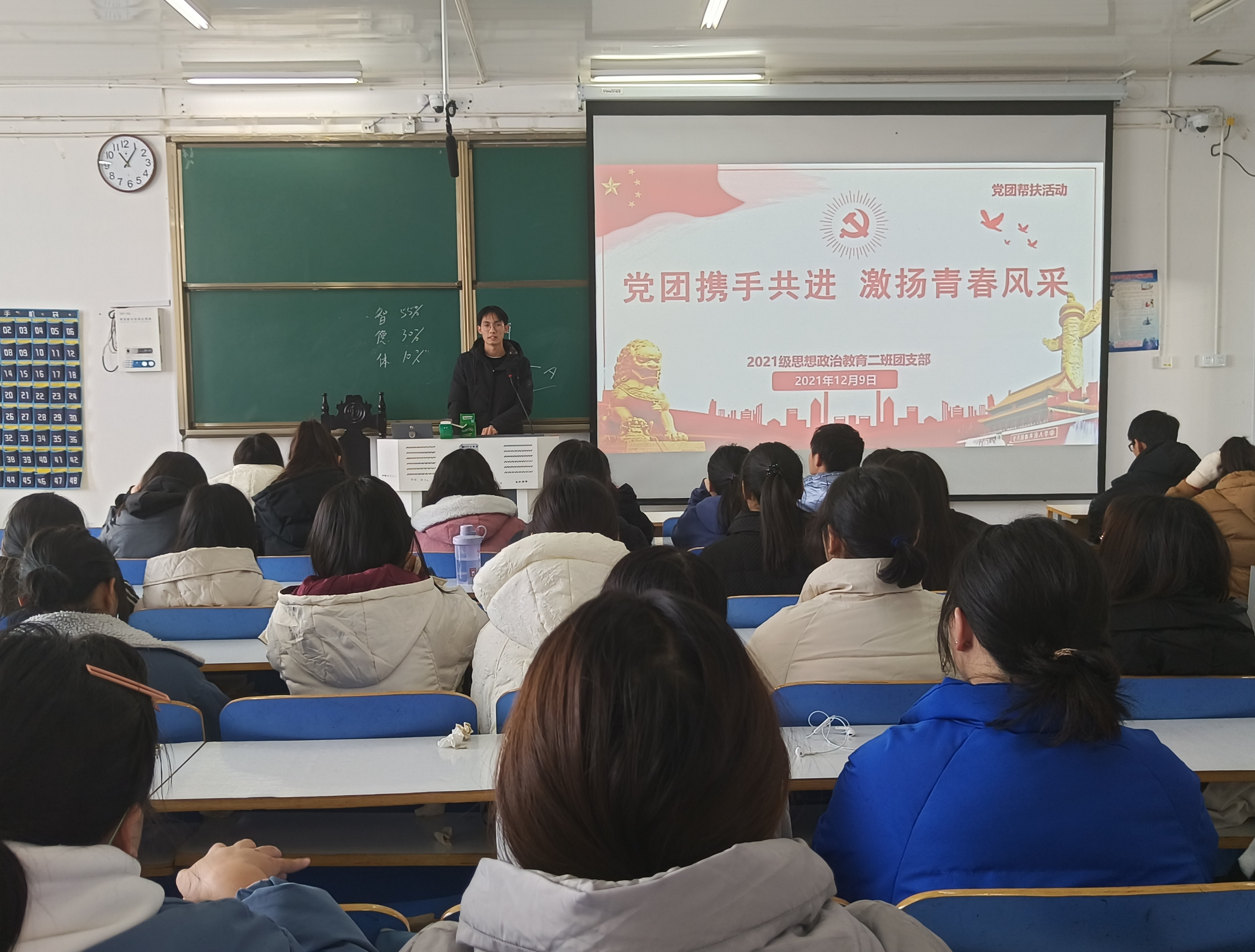 12月9日上午,pp电子官方网站2021级思想政治教育二班在社科楼516教室举办“党团携手共进,激扬青春风采”党团帮扶活动。王明亮、刘鹏及2021级思想政治教育二班全体团员参加此次活动。活动由团支书王婧欣主持。