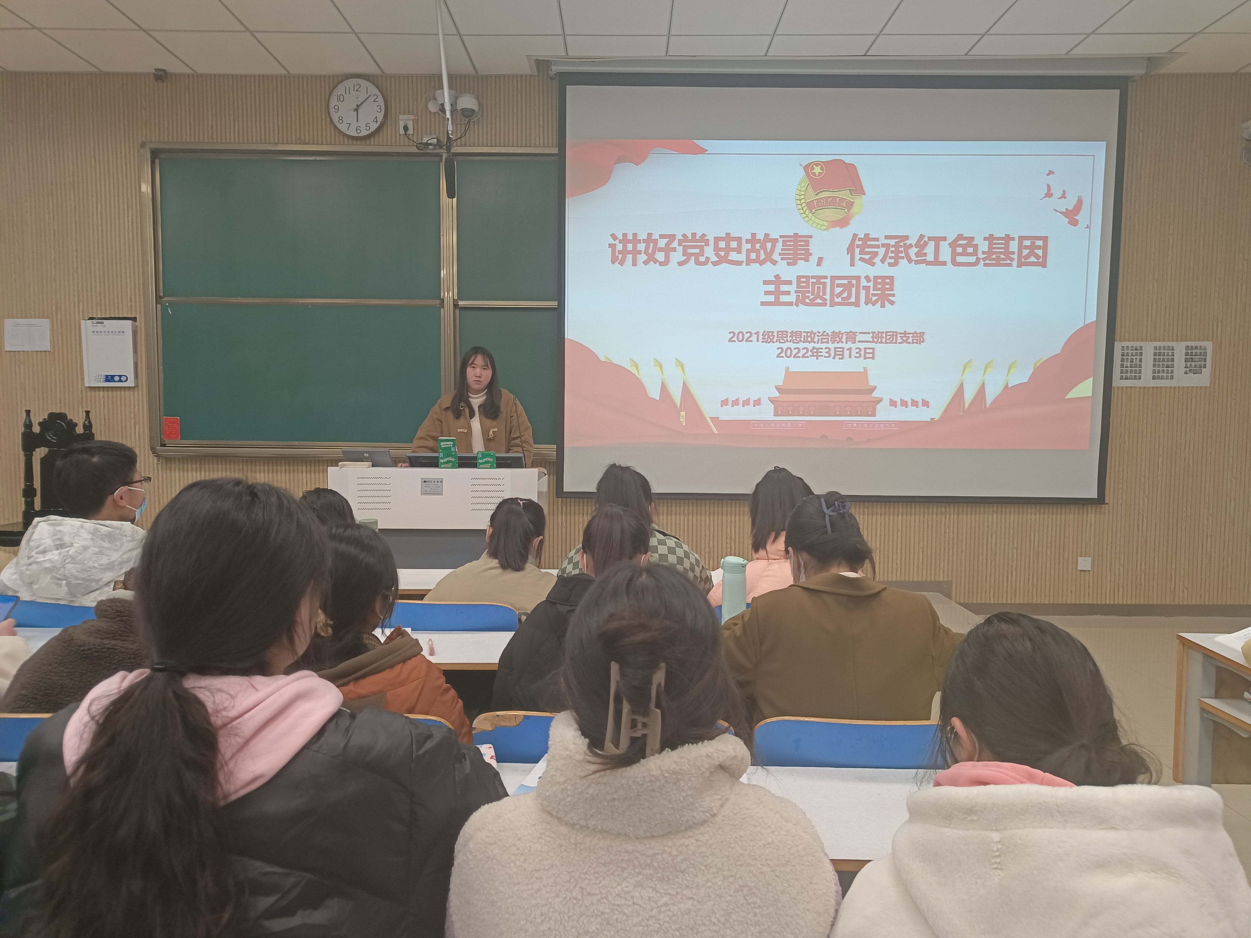 3月13日下午,pp电子官方网站2021级思想政治教育二班在社科楼515教室召开“讲好党史故事,传承红色基因”主题团课。2021级思想政治教育二班全体团员参加此次团课,团课由团支书王婧欣主持。