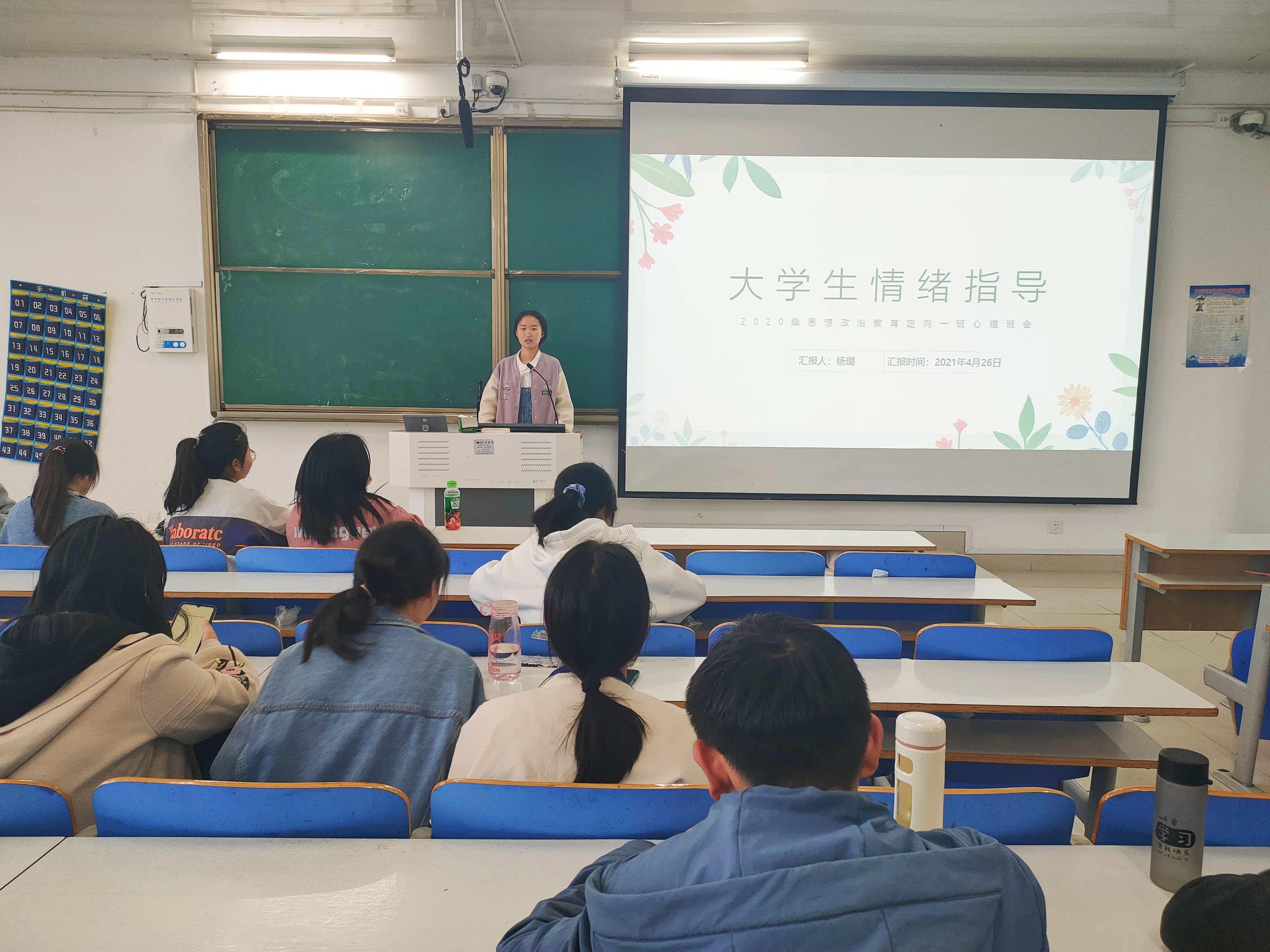 4月26日下午,pp电子官方网站思想政治教育(定向)一班在社科楼514教室顺利举办“大学生情绪指导”心理班会。pp电子官方网站思想政治教育(定向)一班全体学生聆听了此次班会,班会由生活委员杨璐主持。
