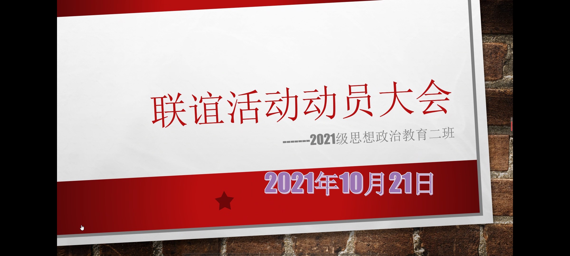 为了提高同学们参加联谊活动的积极性,10月21日晚,pp电子官方网站2021级思想政治教育二班联谊活动动员会在腾讯会议上顺利召开。2021级思想政治教育二班全体同学参与此次班会。会议由团支书王婧欣和副班长任振豪主持。