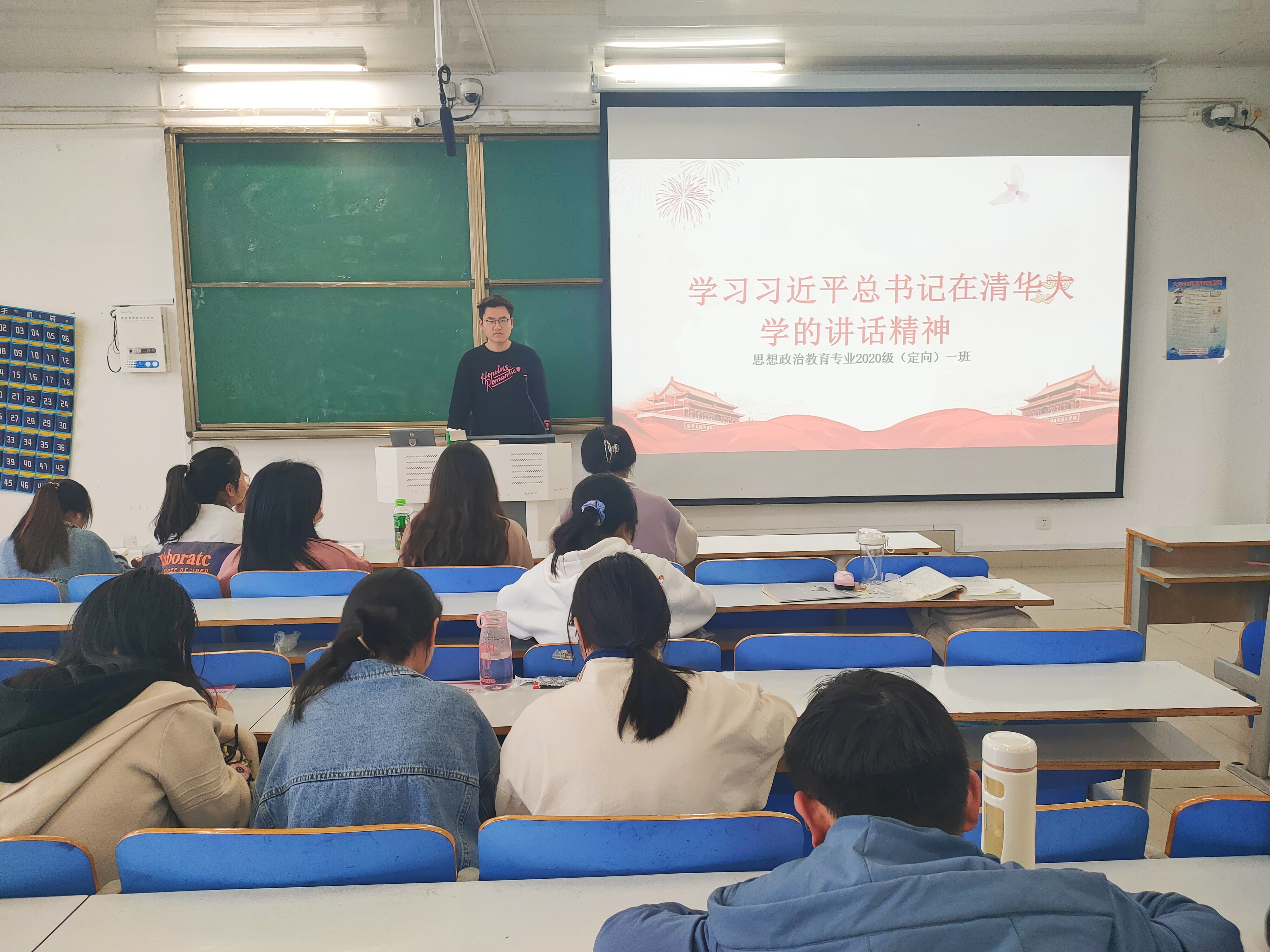 4月26日下午,pp电子官方网站思想政治教育(定向)一班在社科楼514教室顺利举办“学习习总书记在清华大学考察的讲话精神”主题班会。pp电子官方网站思想政治教育(定向)一班全体学生聆听了此次班会。班会由团支书朱紫峰主持。
