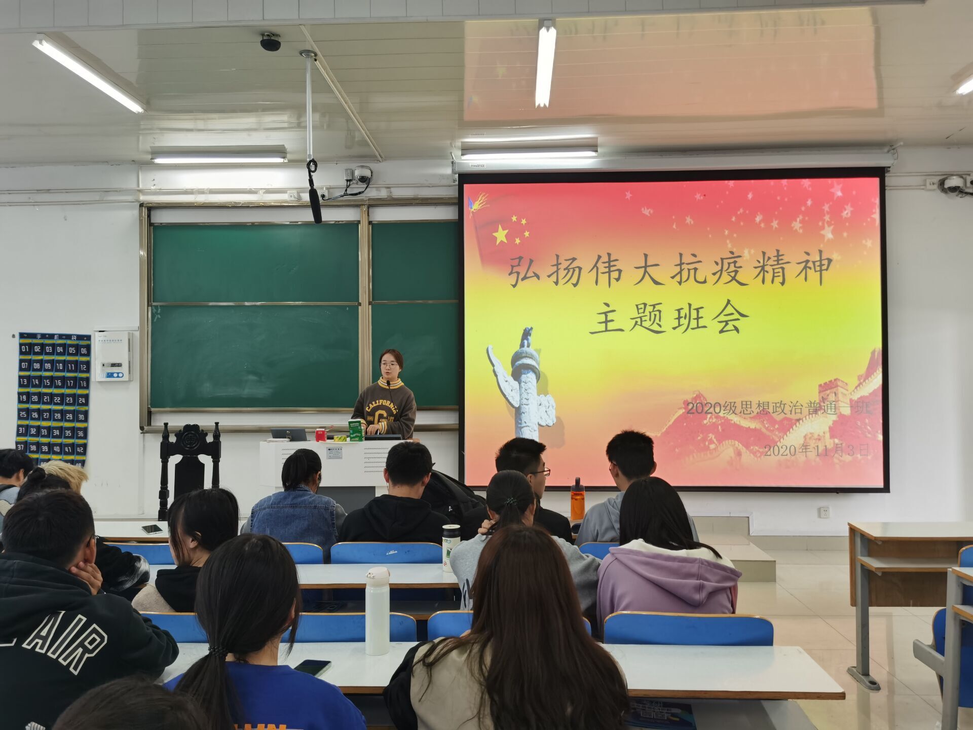 为弘扬伟大抗疫精神,11月3日上午,pp电子官方网站2020级思想政治教育一班全体同学在社科楼514教室举办了弘扬伟大抗疫精神主题班会。班会由团支书卢茜雨主持。