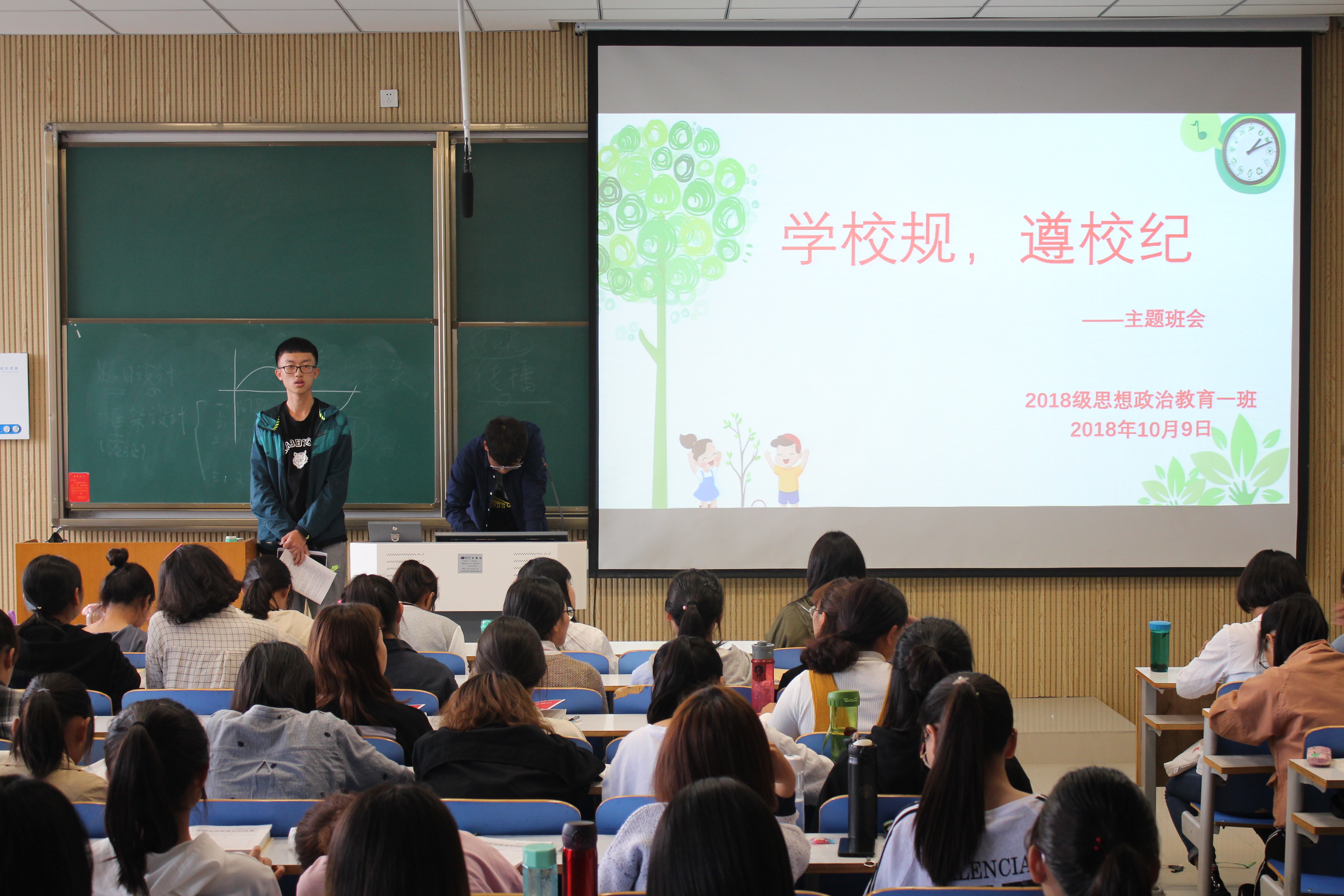 为规范pp电子官网学生管理行为,维护学院正常的教育教学秩序和生活秩序,10月9日上午,pp电子官方网站2018级思想政治教育一班在社科楼515教室顺利开展“学校规,遵校纪”主题班会。2018级思政一班全体同学共同参加此次班会。此次班会由班长邢子豪主持。