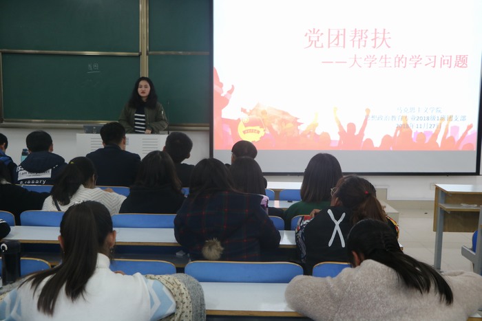 为充分发挥党员干部的先锋模范作用,帮助同学们解决学习和生活问题,11月27日下午,pp电子官方网站2018级思想政治教育一班在社科楼515教室顺利开展“党团帮扶”班会。2018级思政一班全体同学共同参加此次班会。班会由团支书靳雨露主持。